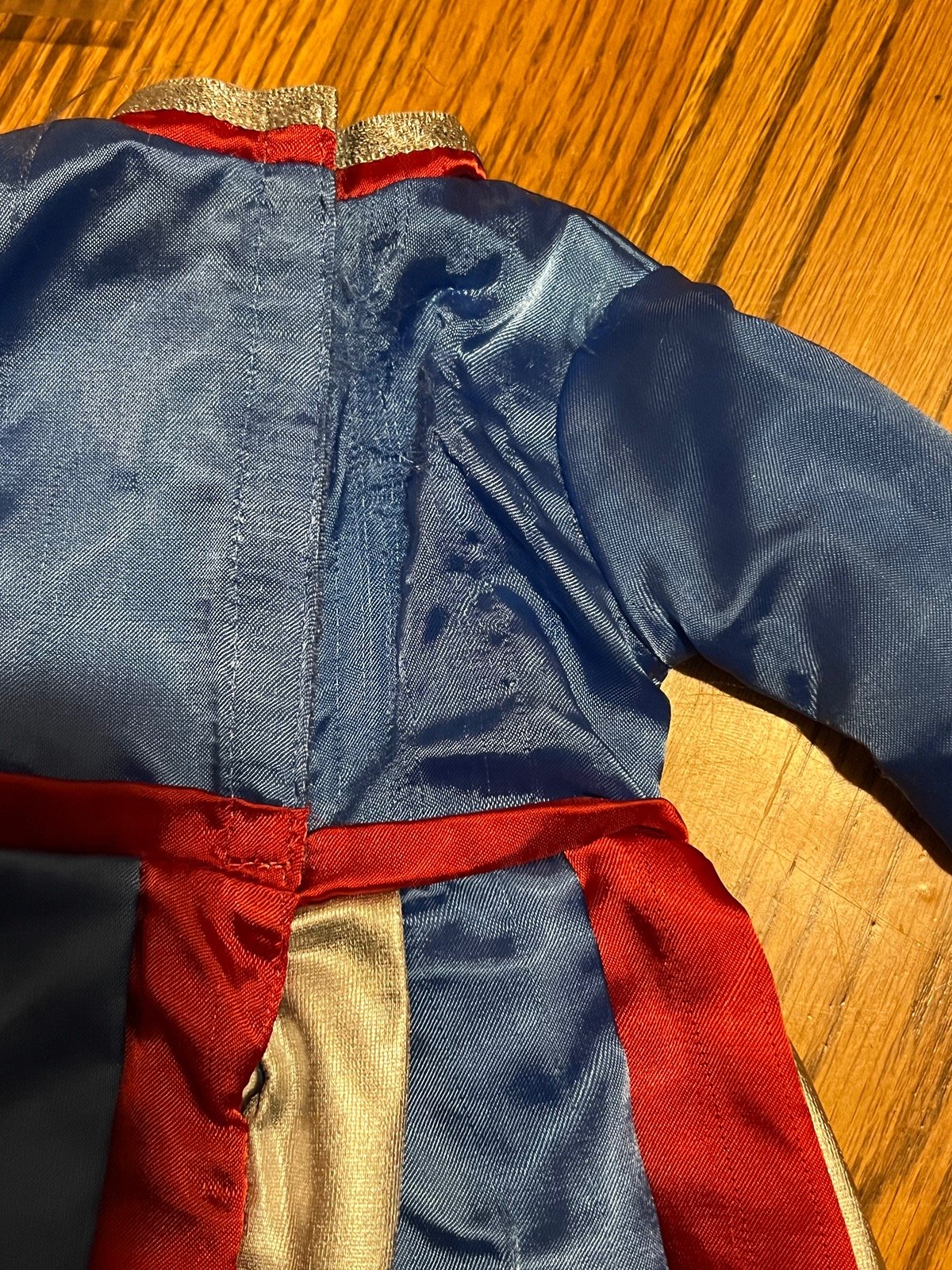 The Molly Miss Victory Costume American Girl Doll Dress is a vintage-inspired outfit designed for 18-inch play dolls. This set includes a dress, bloomers, and headband with stars, perfect for special occasions. This original American Girl outfit is part of the Molly character collection from the 1990s. This retired set is a must-have for collectors and fans of American Girl dolls. This set is used. As such, there are several pulls on the back of the dress from the velcro (see the second photo for a close-up.
