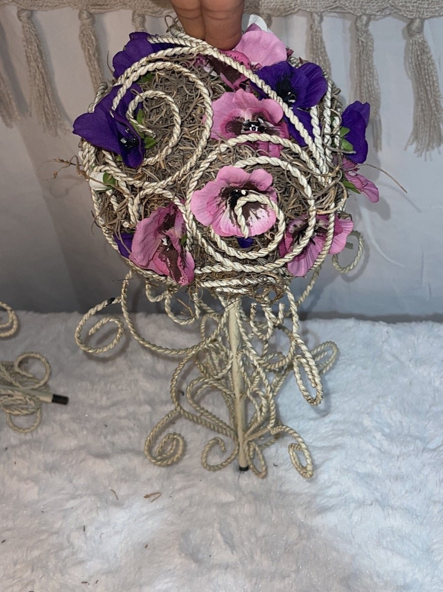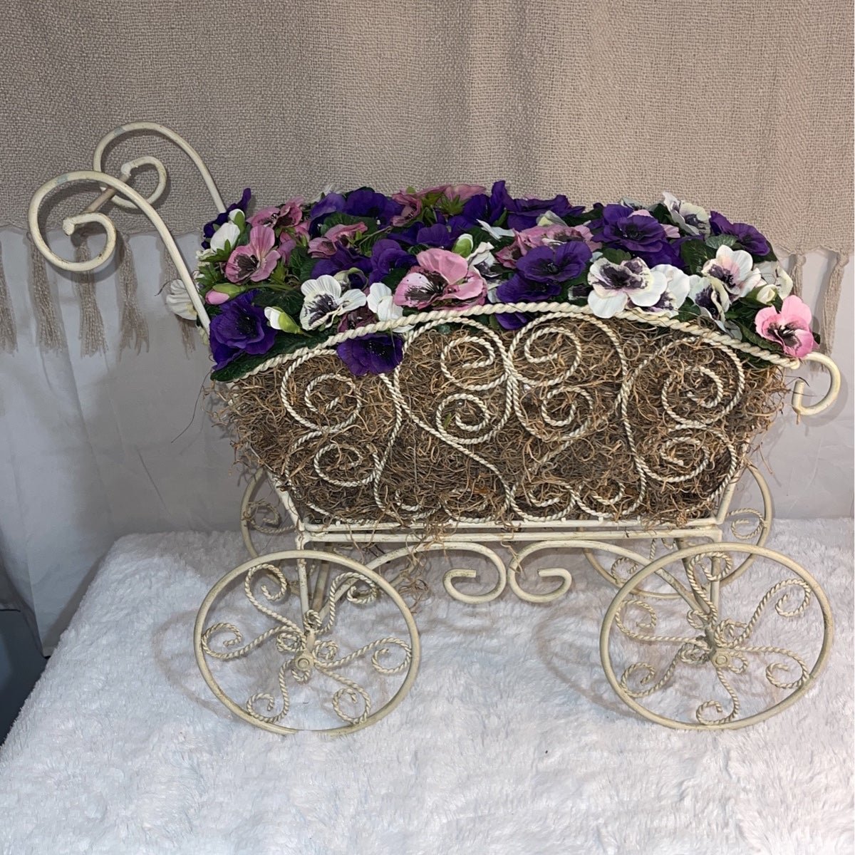 Beautiful antique french carriages, doll chairs and bouquet ornament. A unique Victorian-Style in metal with ornate pierced design and curling framework.