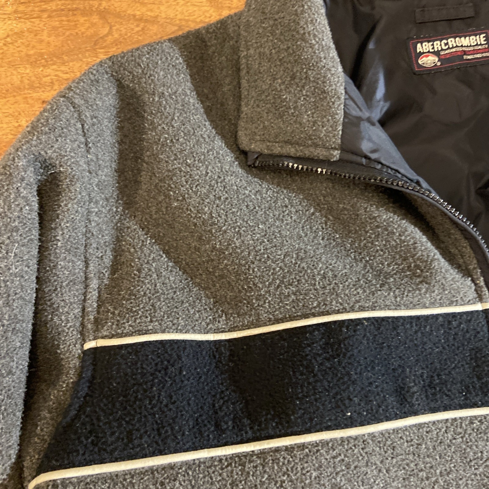This vintage Abercrombie & Fitch windbreaker jacket is a must-have for any man. The jacket is made of durable nylon material and features a cozy fleece lining for added warmth. The stylish gray color and classic Y2K aesthetic windbreaker style make it a versatile addition to any wardrobe.