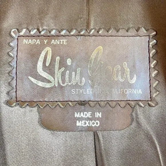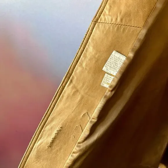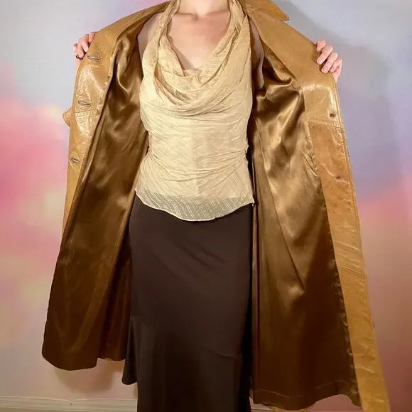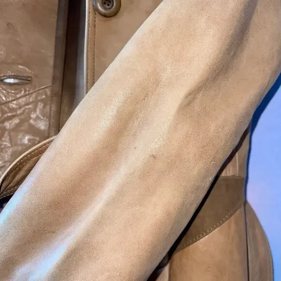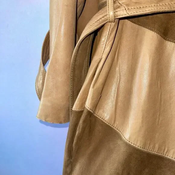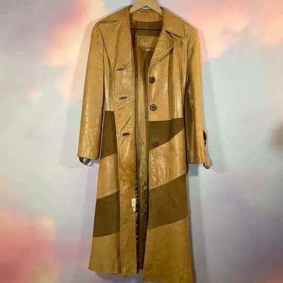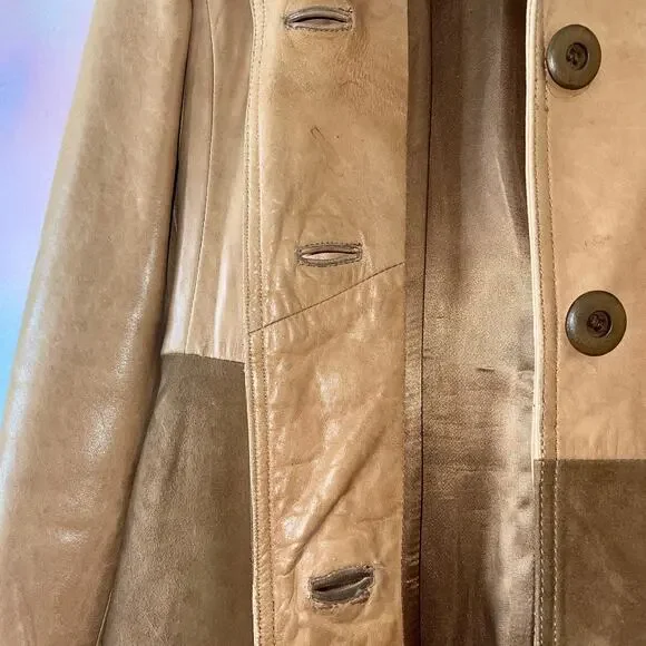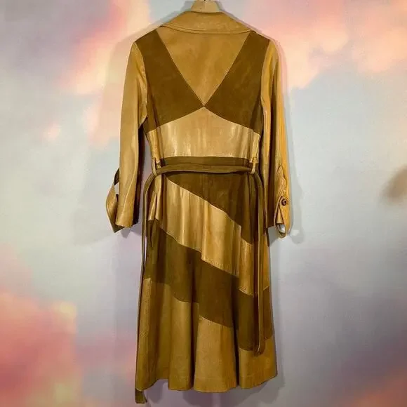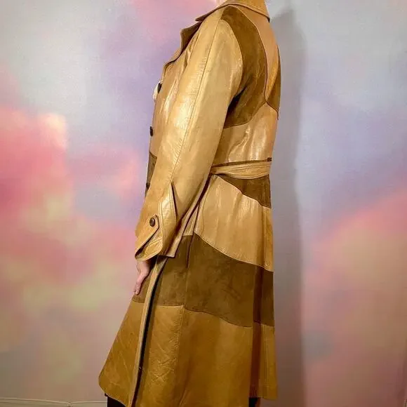 holy frickin MOLY... the most INSANE gorgeous vintage 70s trench coat I have ever laid eyes onlight and dark brown, with belt and hidden pockets100% "fashion leather" and suede exterior, 100% silk interior (SO soft)made in Mexicovery good vintage conditiona few small tears on inside of coat and near button holes (see photo)very minor wear and tear throughout coat (see photos), not clearly noticeable when worn, but professional leather cleaning will make her look fresh again!estimated to be a size small to mediumlaid flat measurements:18.5" pit to pit15.5" waist46" long22.5" sleevesmy measurements: 6’ tallbust: 38” shoulder to shoulder: 16”waist: 31”hips: 39.5”inseam: 31”fits like on me: a little tight on the chest and short on the sleeves- northside fashions - western - striped - outerwear - boho - bohemian - city -