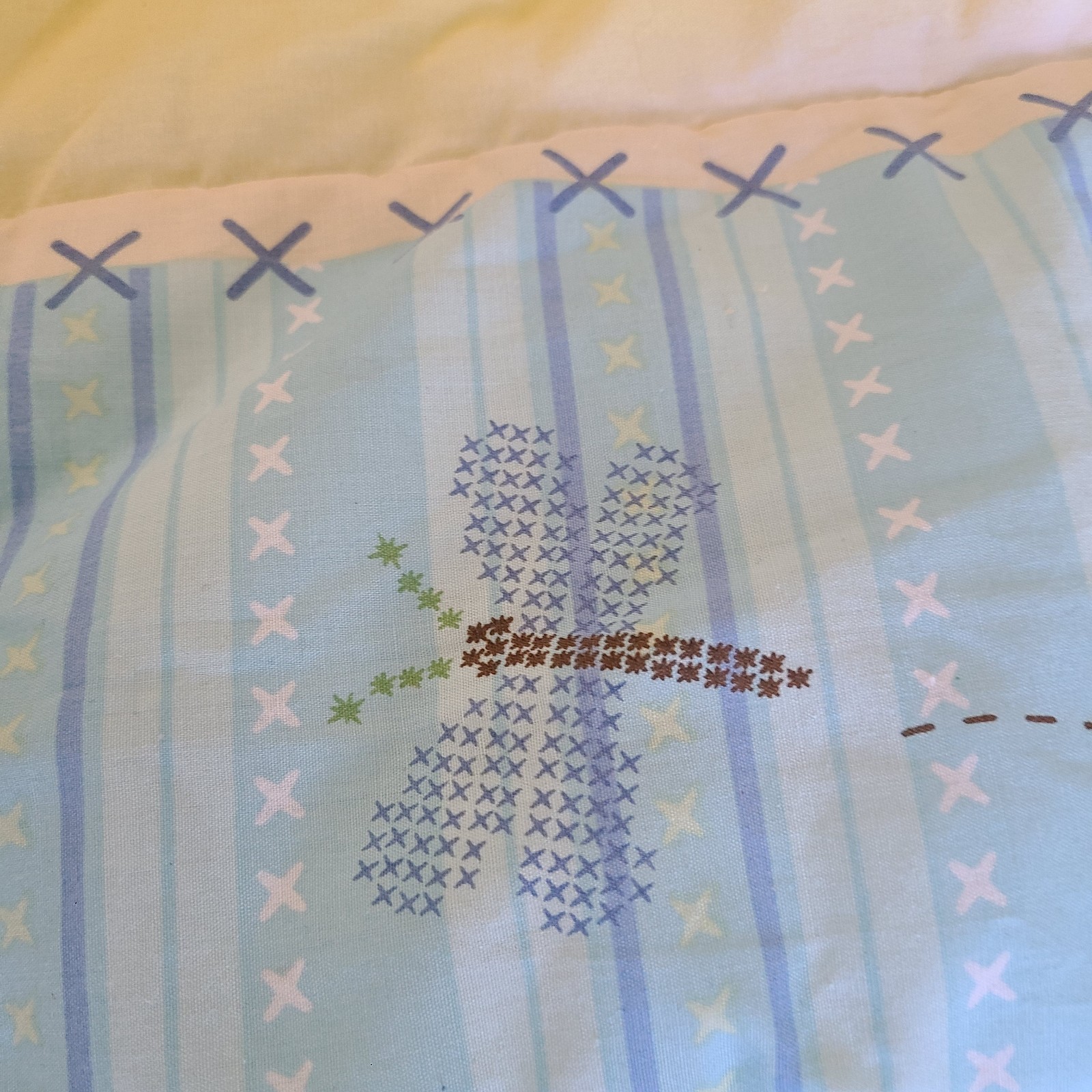 Soft double-sided quilted baby blanket / duvet featuring embroidered & appliqué Pooh, Piglet & Tigger. One side has the full illustrated scene, the other is a repeating character print — two looks in one.