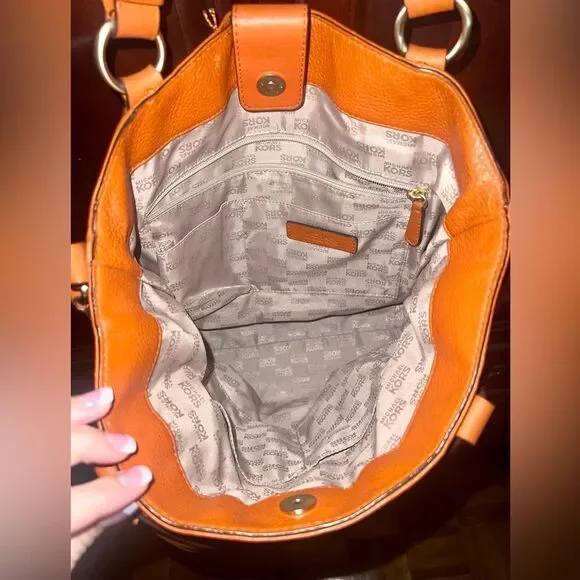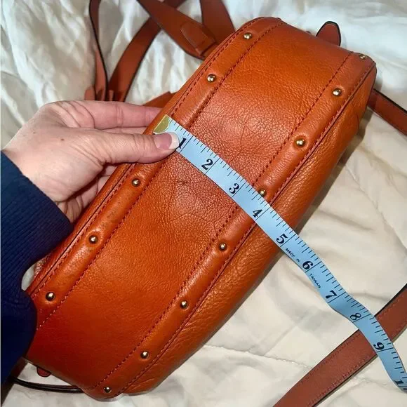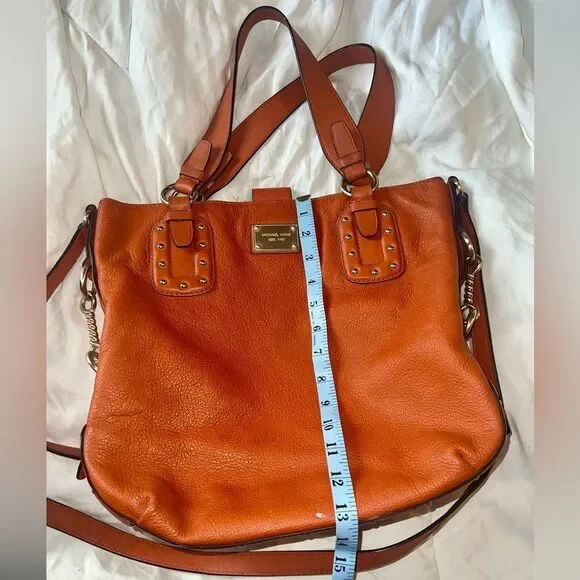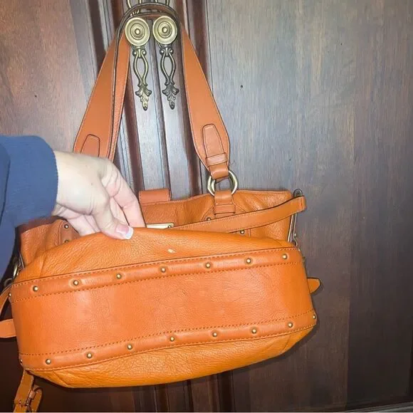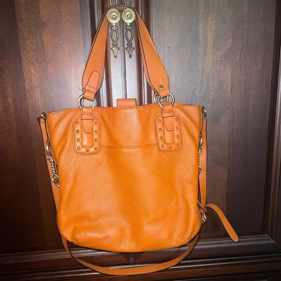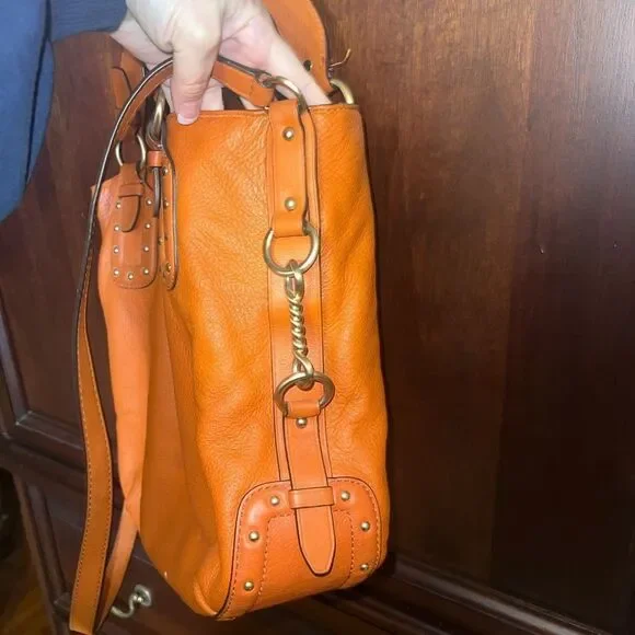 Euc, beautiful burnt orange color, gold tone hardware, genuine leather, has attached shoulder strap and carry handles. Lots of room and pockets inside, logo lining, one outside slip pocket on the back. Some small discolored spots that aren’t noticeable. Rare style, lots of embellishments. Very well made.