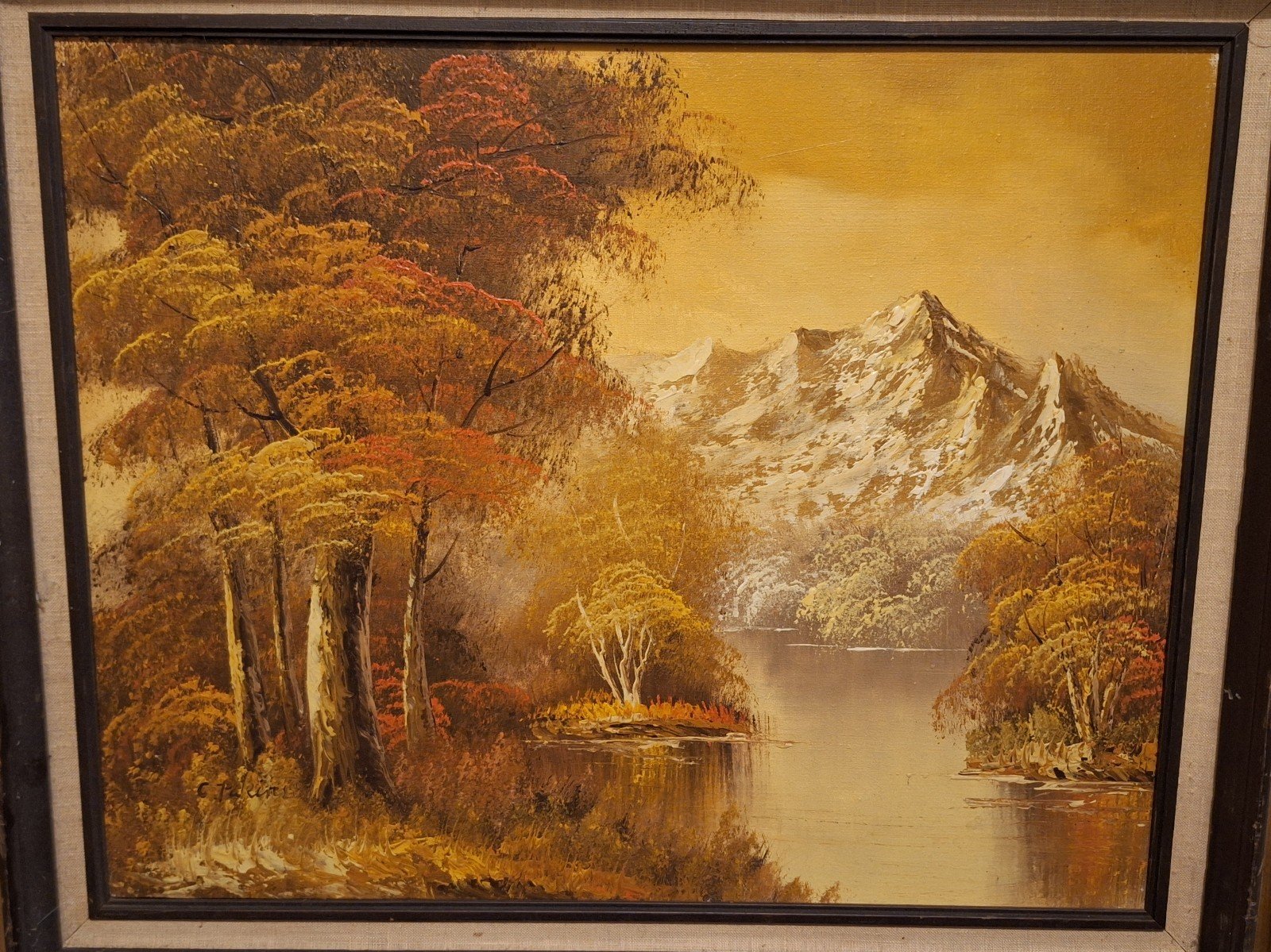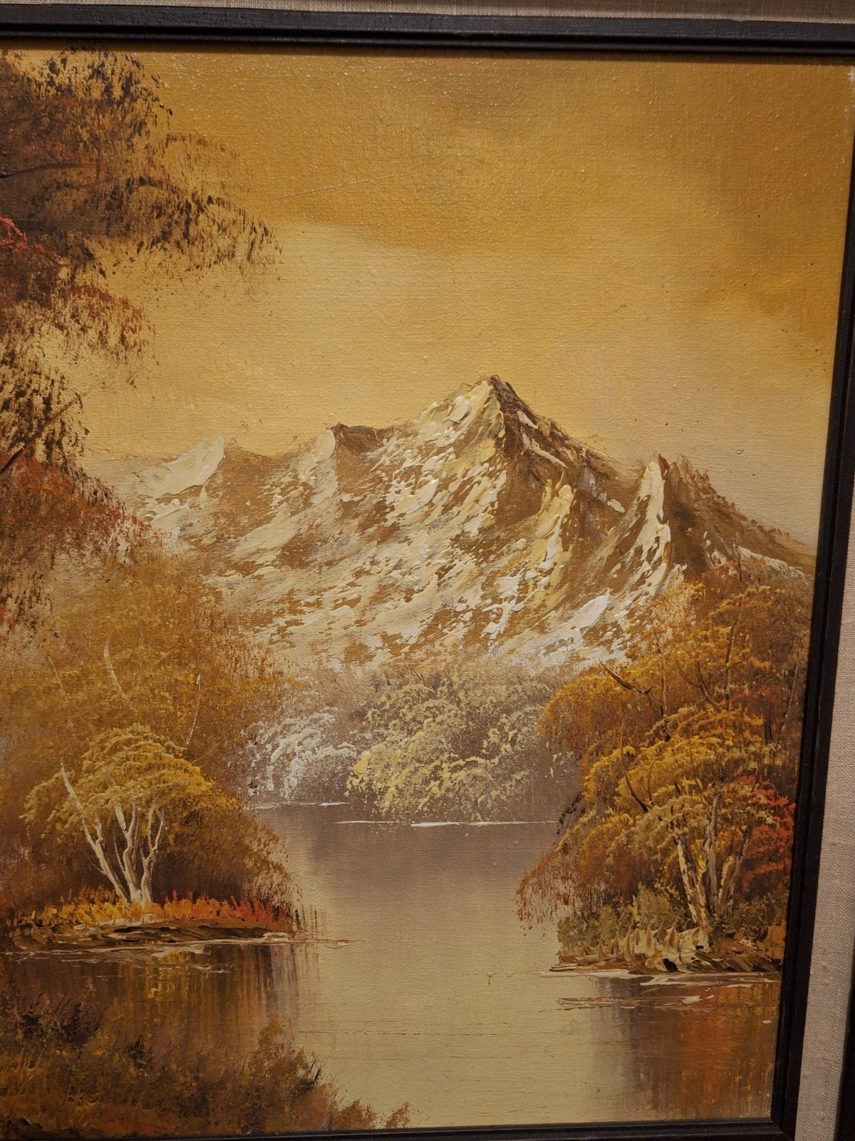 Up for sale is a Vintage Original Signed Oil Painting C. Parkins Framed Mountain Scene. The size is 27" x 23" including the wooden frame. The oil painting itself is 20" x 16". Signed at the bottom left. Beautiful snow mountain and river scene. Masterful skills. Absolute stunning piece of art!