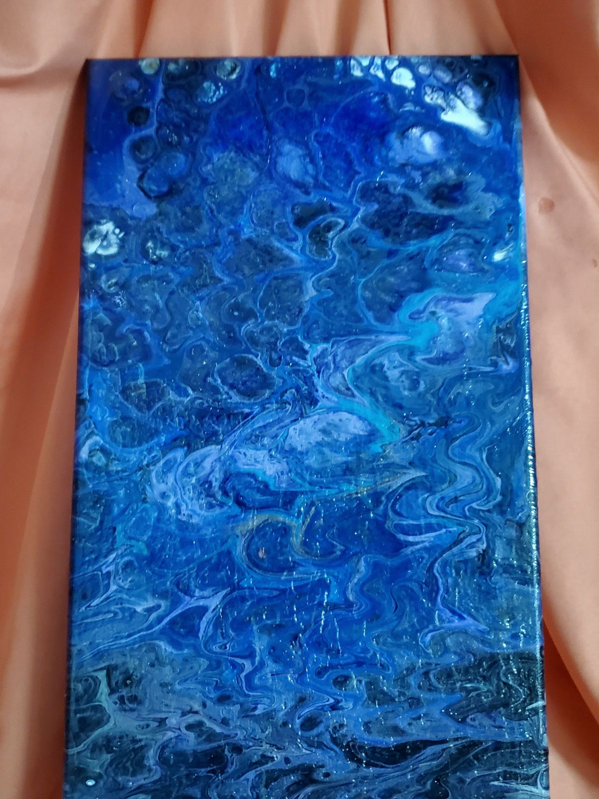 Up for sale is a beautiful one-of-a-kind piece of acrylic pour canvas art. It is 11"×20" and is sealed with a textured resin to ensure it will last. The longer you look at this piece, the more impressive and intricate it becomes. The subtle change of blue to purple from a distance, and a world of color up close. This original art piece is sure to be a fantastic addition to your home!