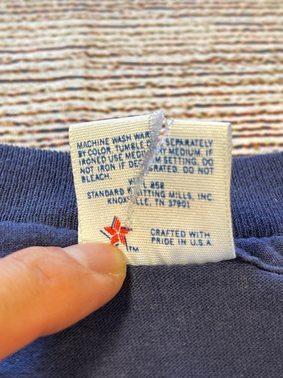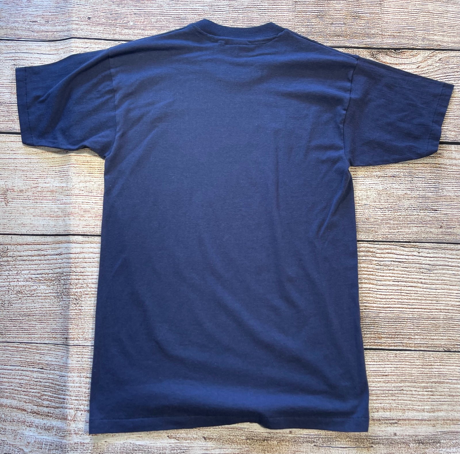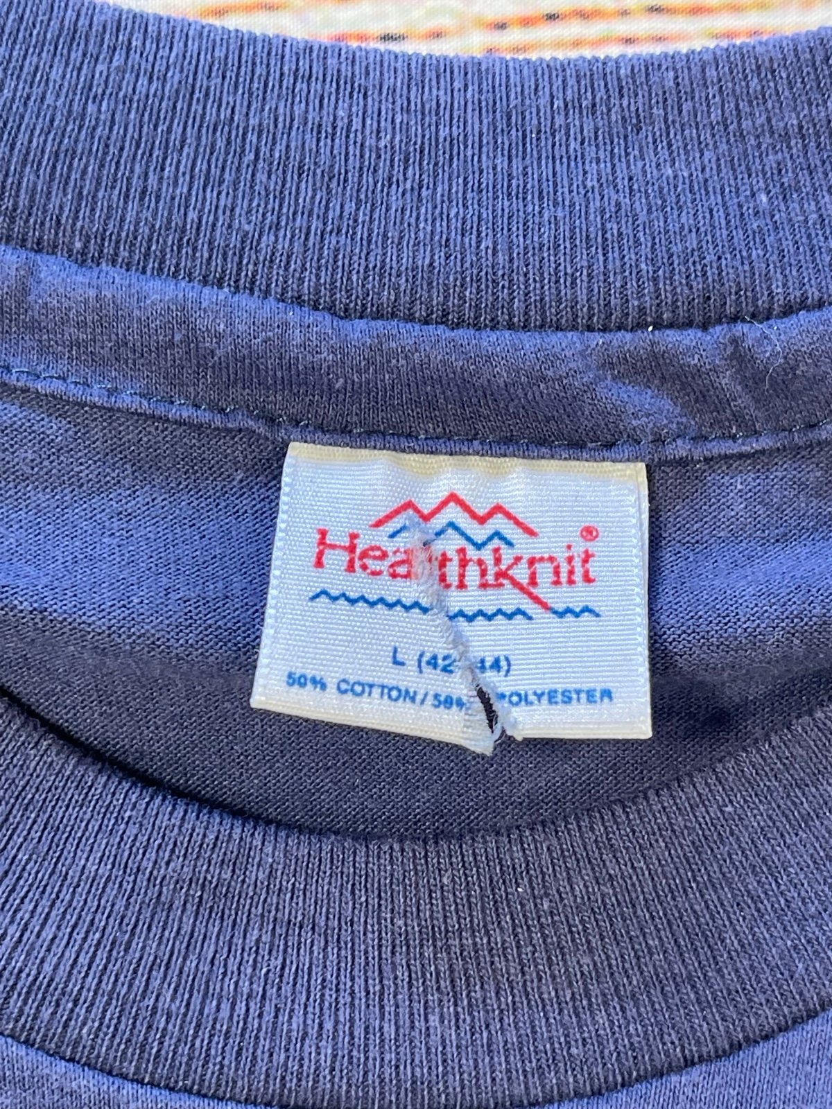 The product is a large vintage Jesus Surf t-shirt by Healthknit. This slim fit t-shirt features a solid blue color and a retro 90s design with a quote from "On Christ the Solid Rock I Stand". The shirt is perfect for men who appreciate surf and rock themes, along with religious messages. The short sleeve t-shirt is a unique addition to anyone's wardrobe, offering a blend of vintage style and contemporary flair.
