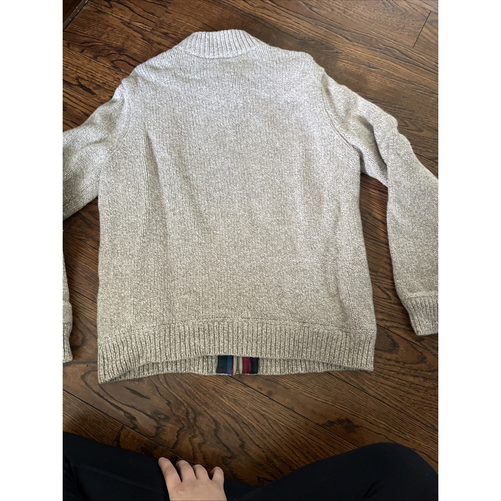 This LL Bean sweater is a men's size L in a tan color with a solid pattern. Made from wool with a tight-knit fabric, it features a mandarin collar, long sleeves, and a full zip for easy wear. Perfect for outdoor activities like hiking, walking, or golf, this vintage sweater exudes a classic, preppy style with a touch of Maine charm. It is lined, heavyweight, and comes with pockets for added functionality. Perfect for casual or business occasions in the winter, fall, or spring seasons. Ideal for the fisherman character, this sweater is a versatile and high-quality addition to any wardrobe.