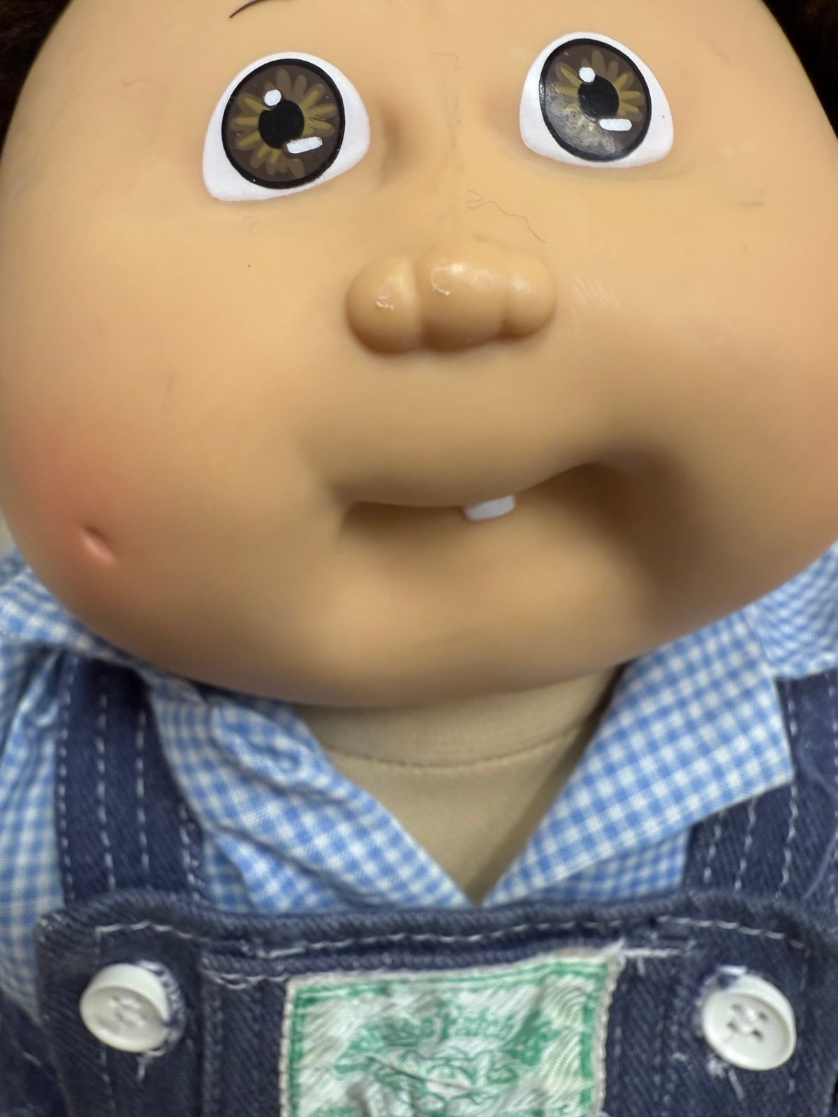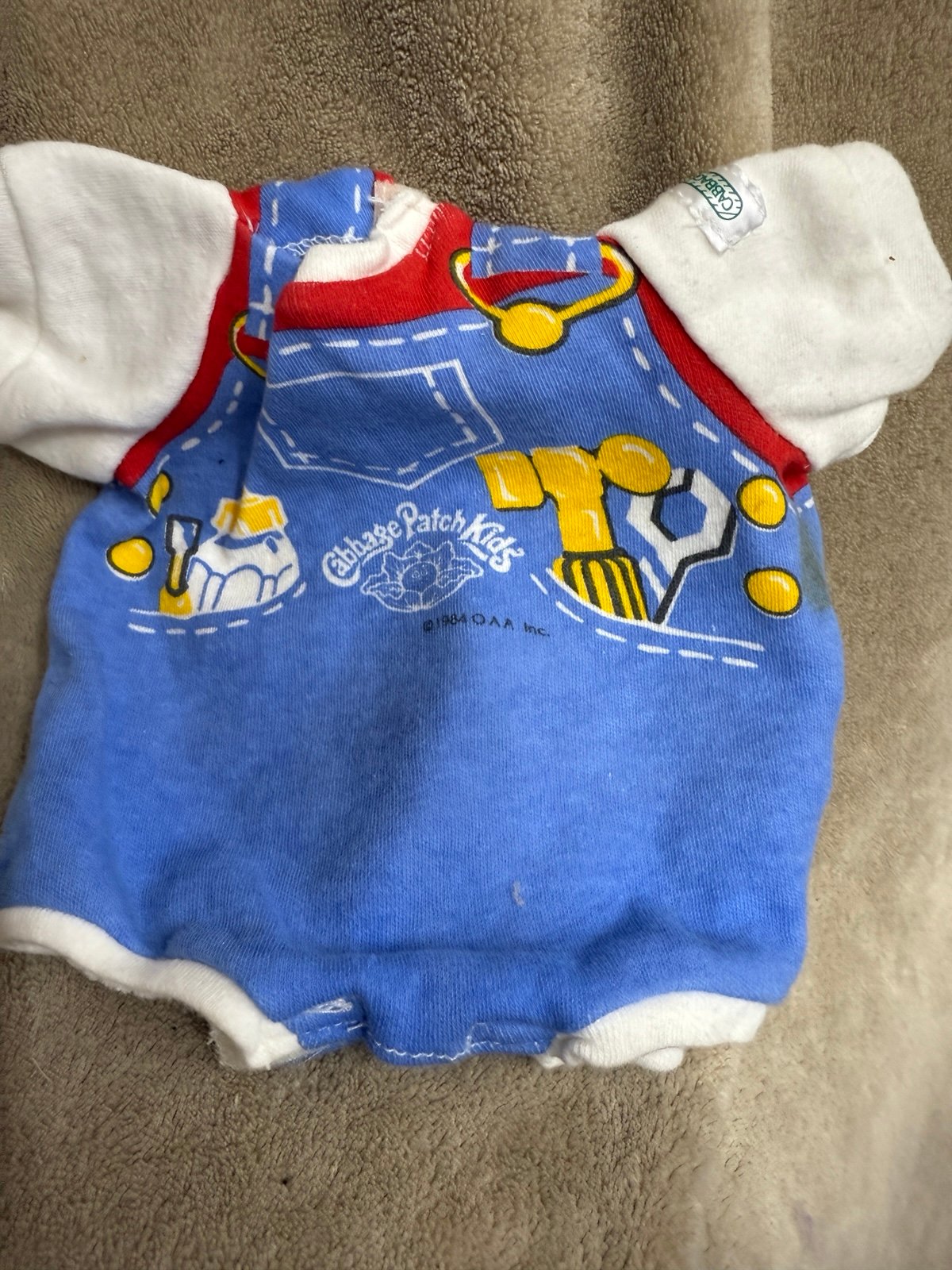 This very cute boy has short shaggy brown hair, brown eyes, two dimples, one tooth. He is wearing blue denim Cabbage Patch kids short overalls and a blue cabbage patch kid checked shirt, white cabbage patch kids lace up shoes with blue stripes. Included is an extra red and blue Cabbage patch kid painters romper. The doll and clothes are clean no marks. Pet and smoke free home. OK factory. Xavier Roberts 1985 blue signature