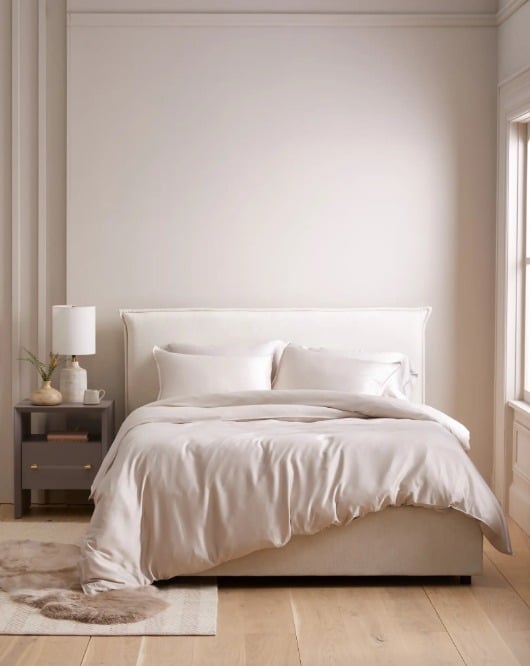 The super soft duvet set you've always dreamed of. Our mid-weight bamboo duvet set is 100% viscose from organic bamboo which is one of the planet's most resource-efficient materials as it grows quickly and uses far less water than cotton. Our duvet set is luxuriously soft and silky smooth with a sateen weave and temperature regulating properties. Featuring clean, tailored hems on the shams and duvet, this set is perfect for year-round comfort.
