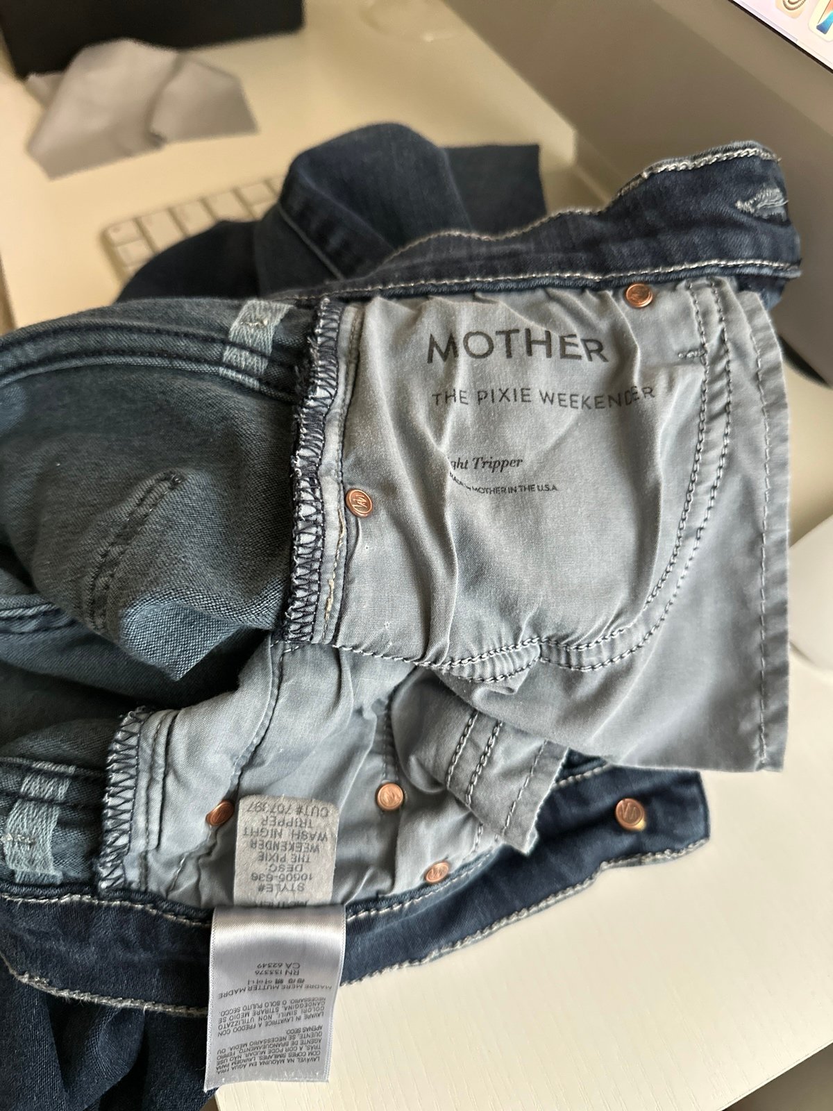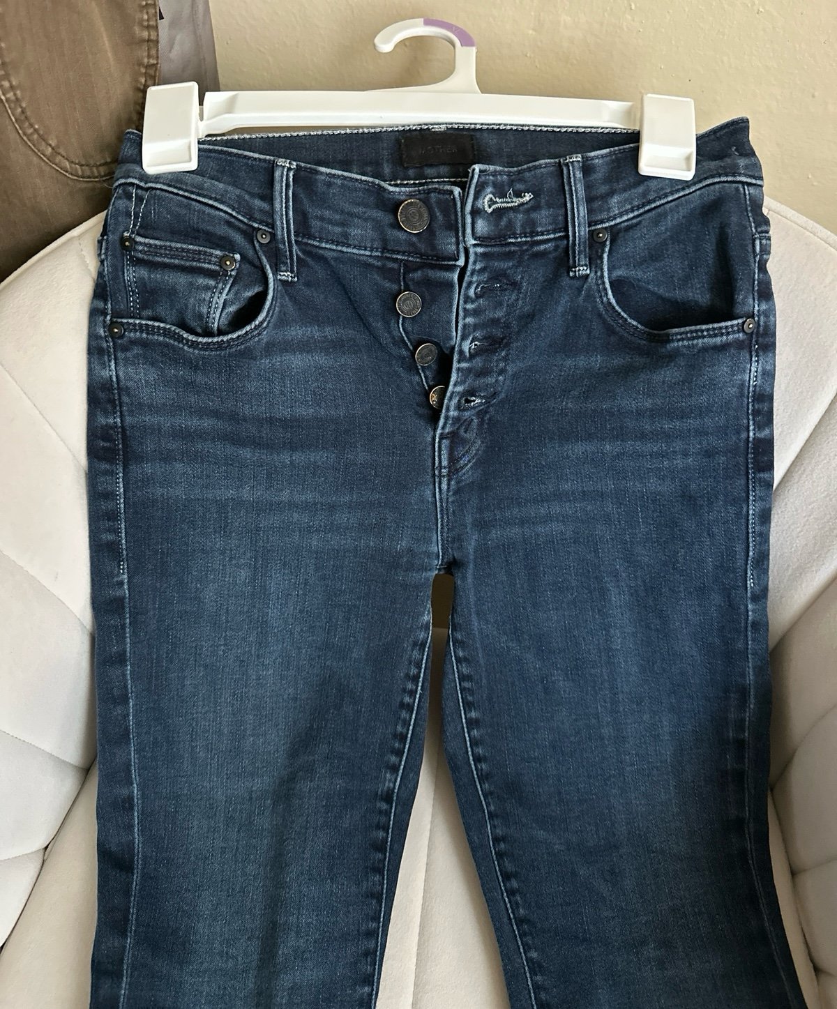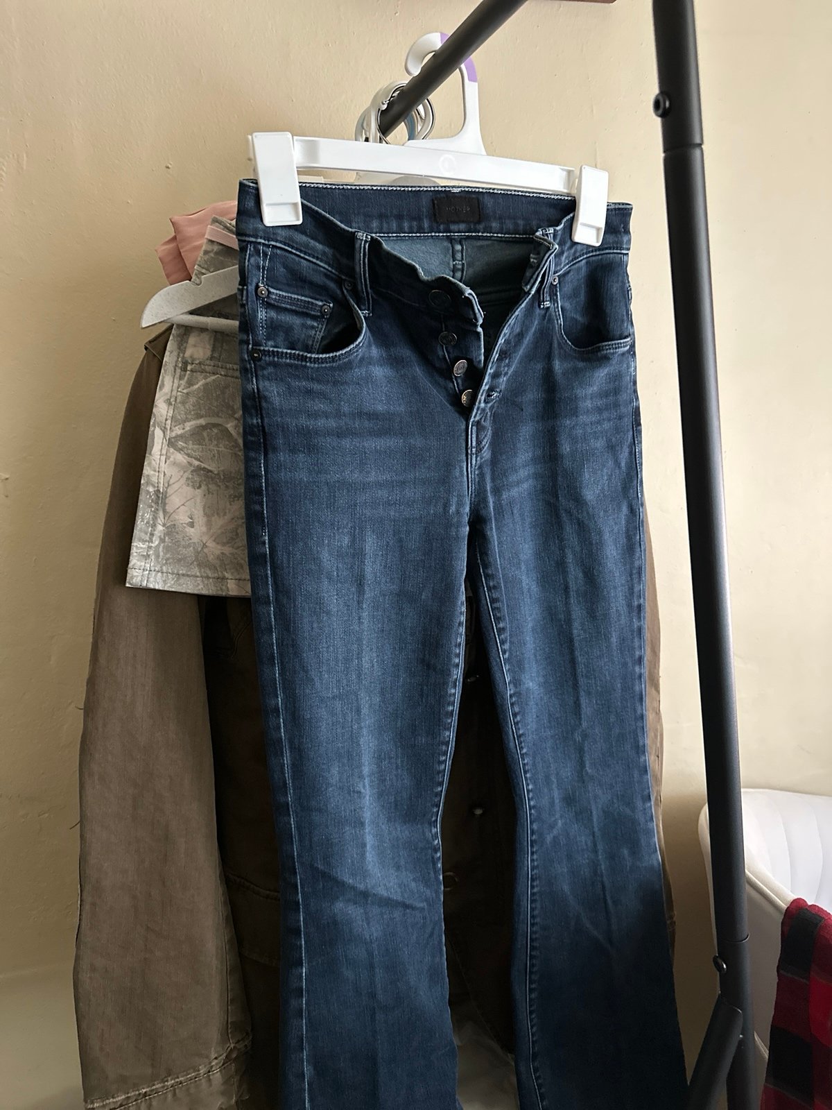 Mother's most popular mid-rise flare is made with a comfortable stretch denim, and designed with an exposed button-fly and a 31-inch inseam with a clean hem. Night Tripper is a dark blue wash with tonal hardware and subtle fading and whiskering.