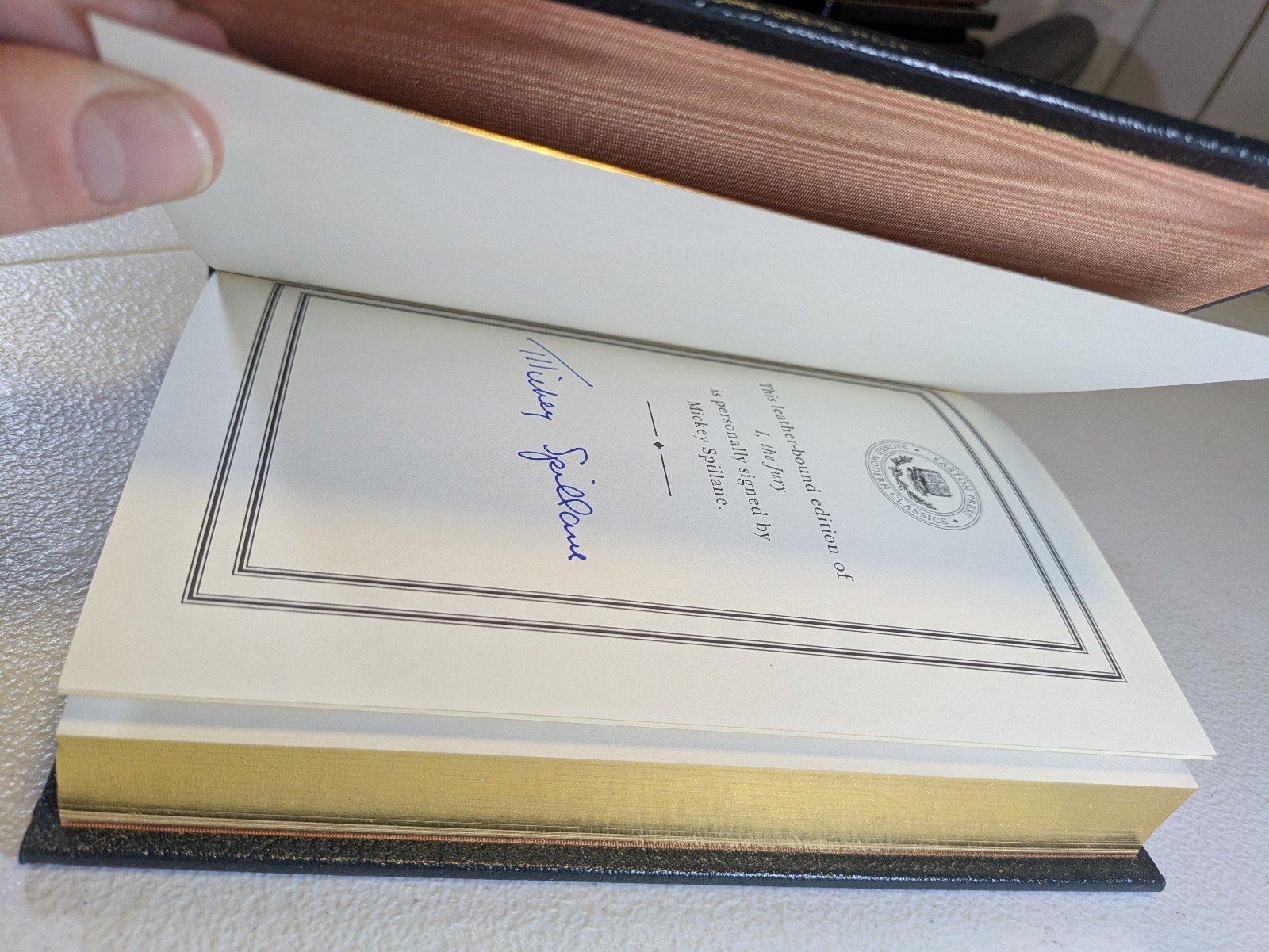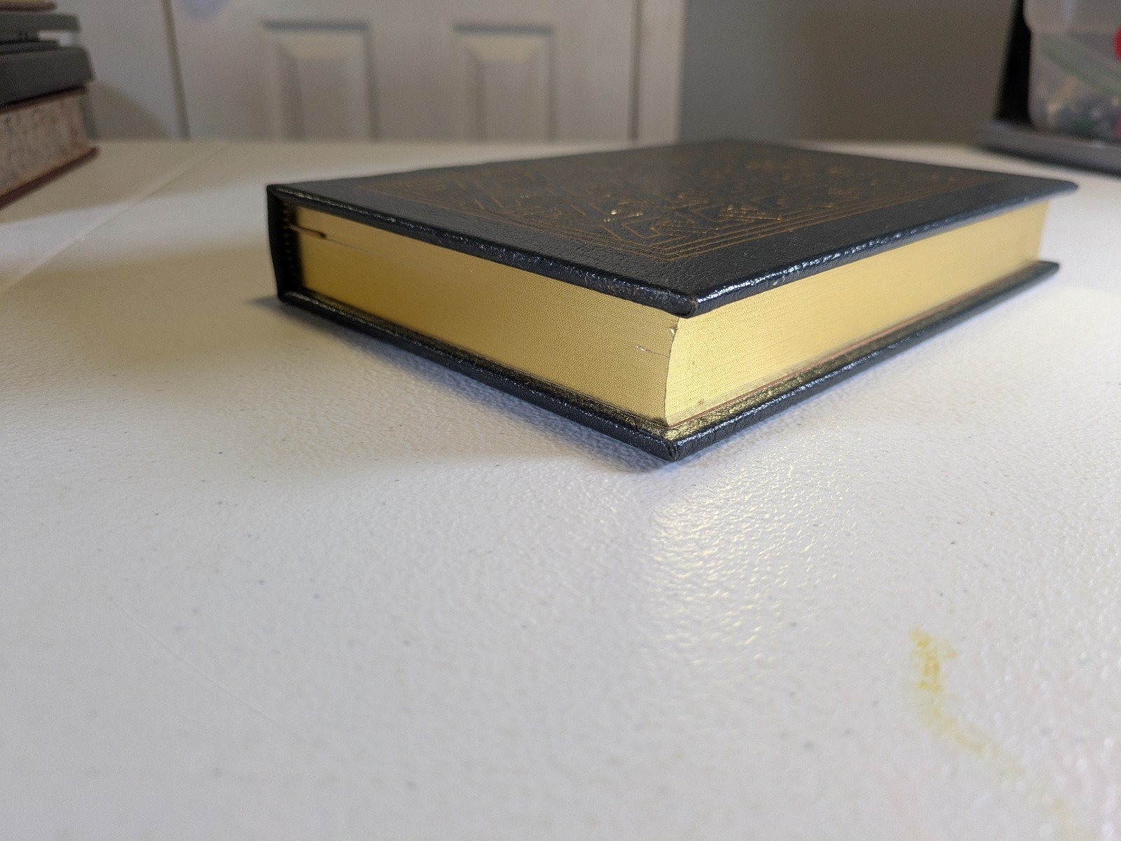 Looks to be brand new and unread. There are some blemishas on this that are noted in the pictures. The top of the edging on the pages does have a dent that you can see in the pictures appears to be missing The gold leaf and Etc there.