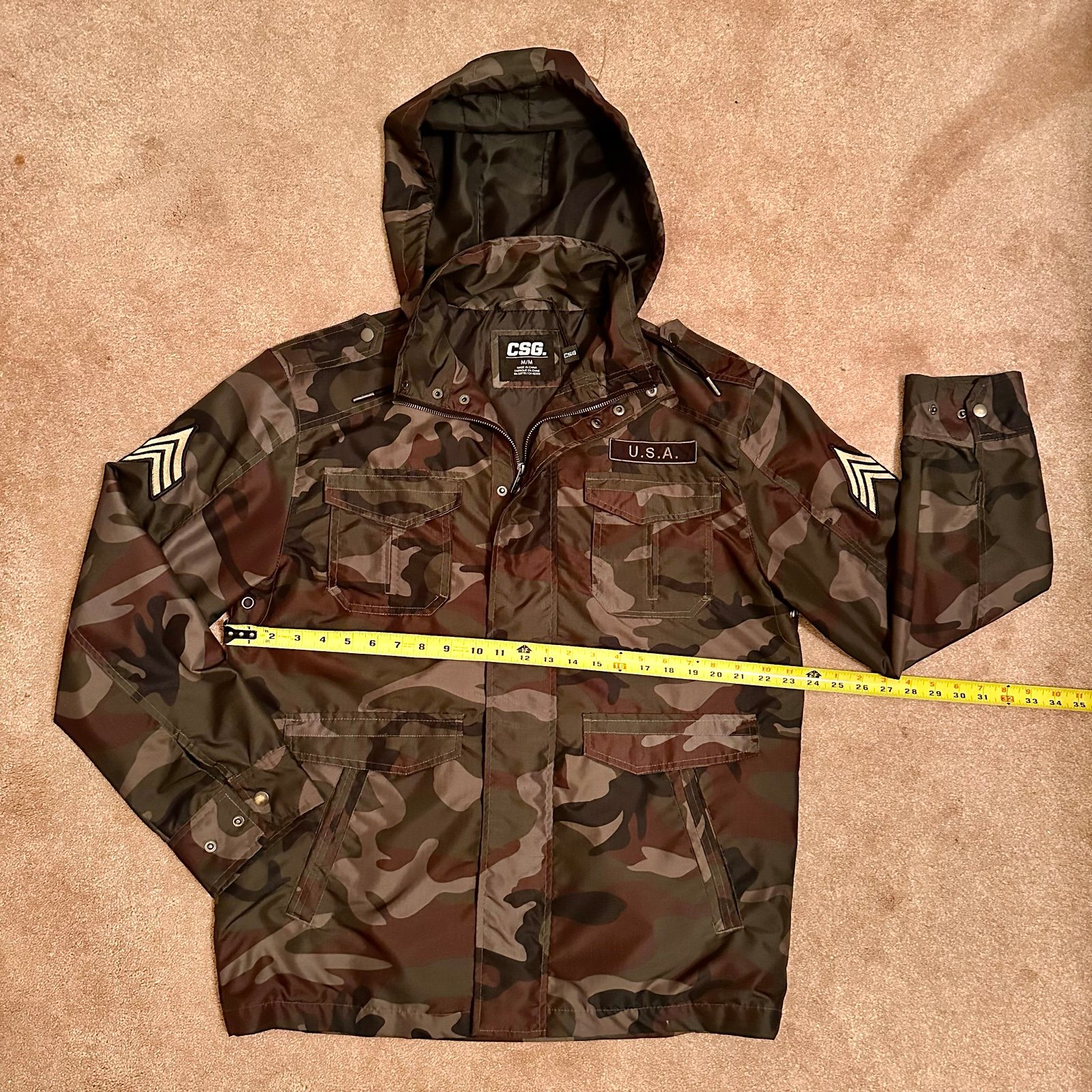 Here is a Men’s Size Medium, 4 Colored Camouflage, Zip-up Windbreaker Jacket made by CSG. Constructed with a Connected, Draw String Hood that can be tucked away inside of the zipper closing collar, this Jacket has a Snap Button Flap to cover the Full Zipper Front Closure. Designed with Functioning, 4 Snap Button Pockets, 2 Off Side Seemed Open Pockets and an Inside left Breast Pocket, this Jacket has 2 Snap Button Wrist Closures for a more Custom Fit. Decked out with a Full 100% Polyester Lining, this 100% Polyester Windbreaker Jacket is Pre-Owned, in Excellent Condition and has no signs of gentle use. This Long Sleeved Windbreaker Jacket has Decorative Chevrons, an Accent “USA” Name Tape, Snap Button Shoulder Epaulets and is from a pet & smoke free home.