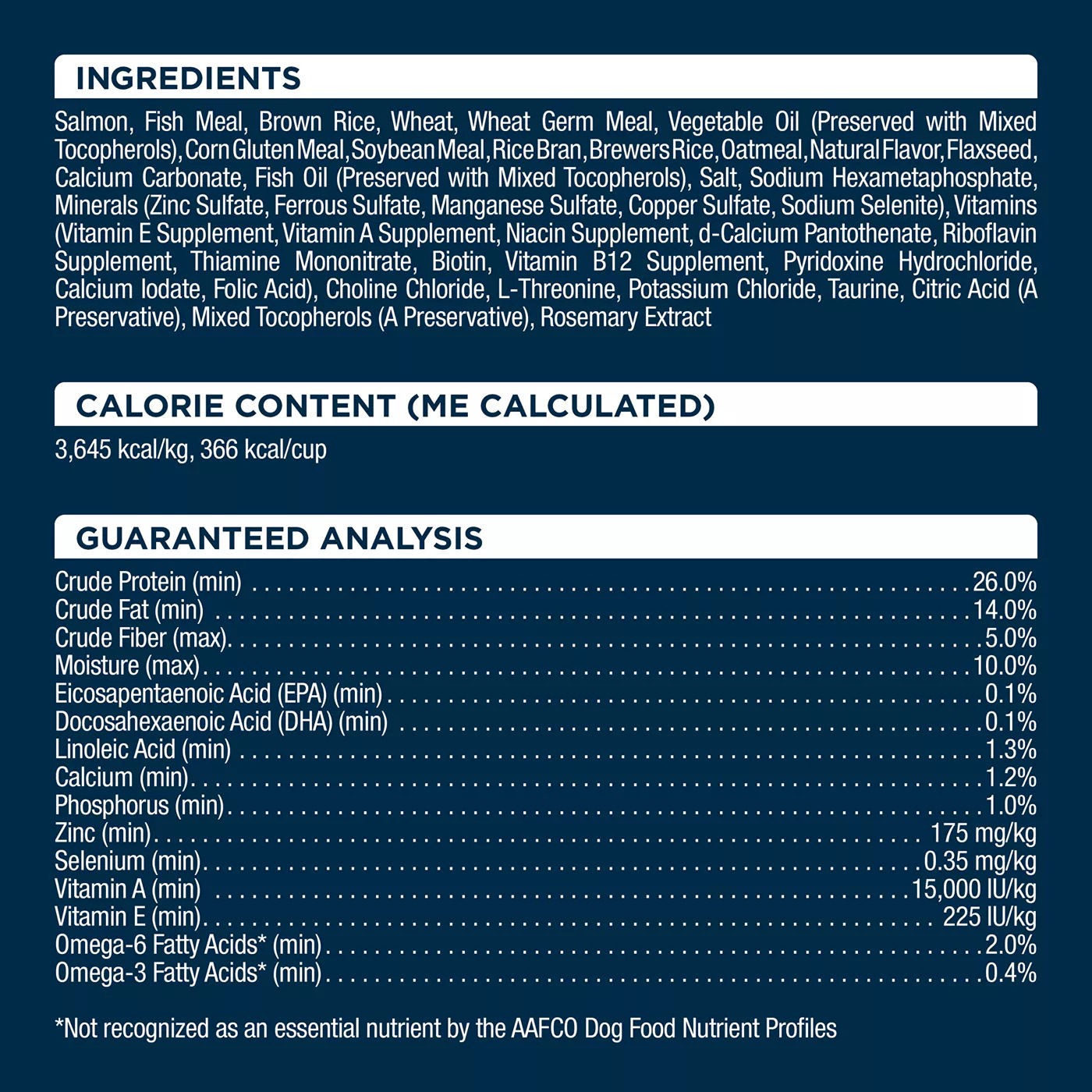 Veterinarian-recommended, sensitive formula with salmon as the #1 ingredient. Gentle on the stomach and enriched with omega fatty acids to support healthy skin and coat. Suitable for all life stages, ideal for multi-dog households. Features Ora-Shield System® for dental health by helping reduce plaque and tartar. No artificial colors, flavors, or preservatives.