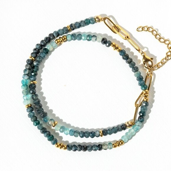 A dreamy strand of faceted ombre blue tourmaline beads with flashes of ocean-inspired color, accented with 18K waterproof stainless steel gold beads for just the right touch of shine. This necklace is finished with a non-tarnish gold chain and clasp, made to last through everyday wear, vacation days, and beyond.