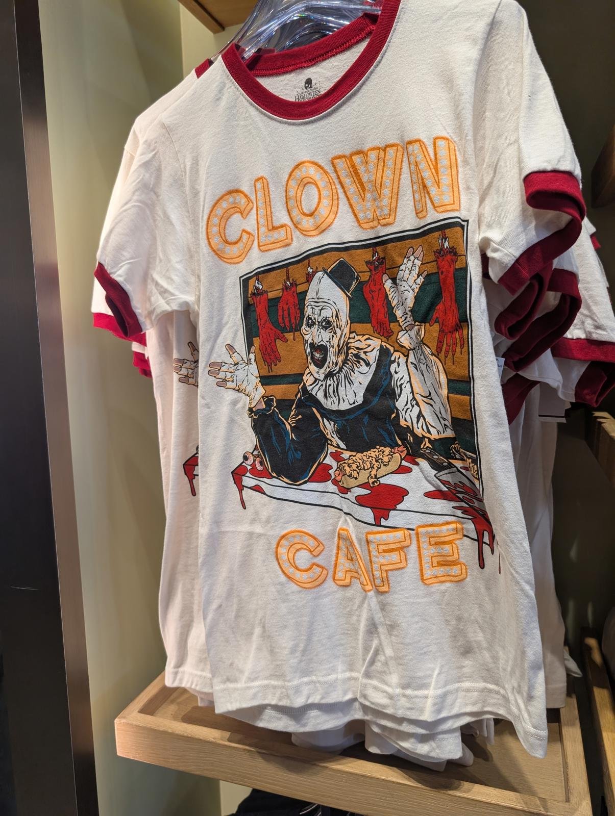 Features a graphic print of a clown with the text "Clown Cafe" on the front.