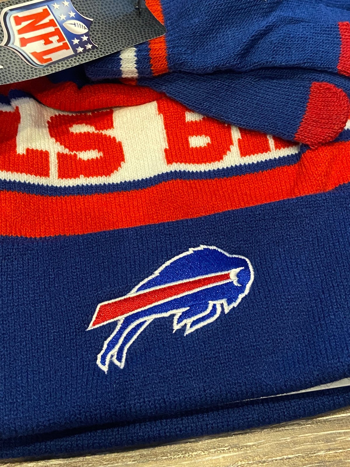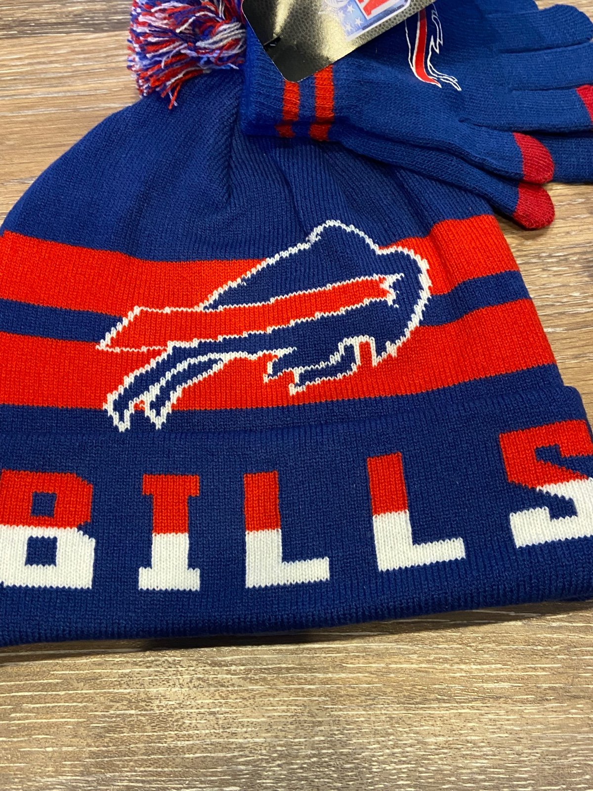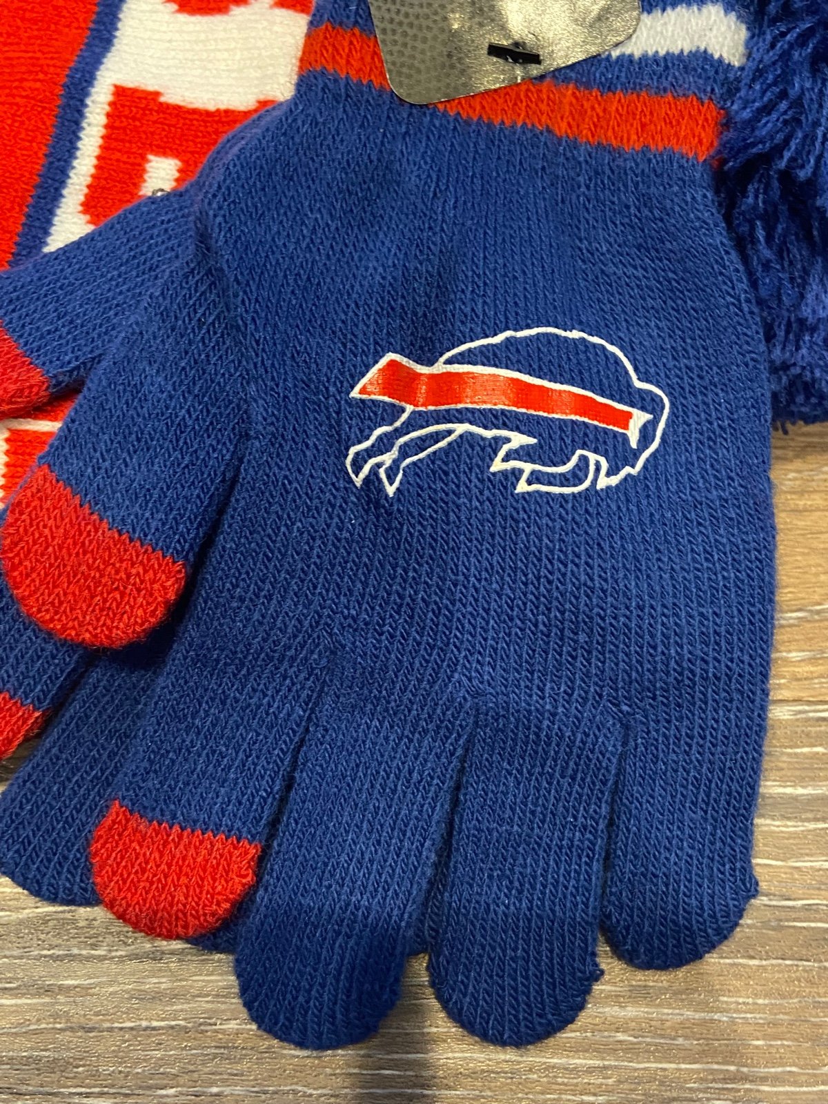New!! Match with your little. Adult hat (one size fits most) with charging buffalo and Bills in the weave. Red, white and blue pom. Knit gloves with charging buffalo logo. Youth hat with embroidered charging buffalo and Bills in the weave. Blue pom. Knit gloves with charging buffalo. Retail $80!