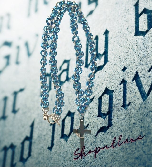The Chain: beautifully woven chainmaille in light blue, royal blue and silver, with a royal crown toggle closure.