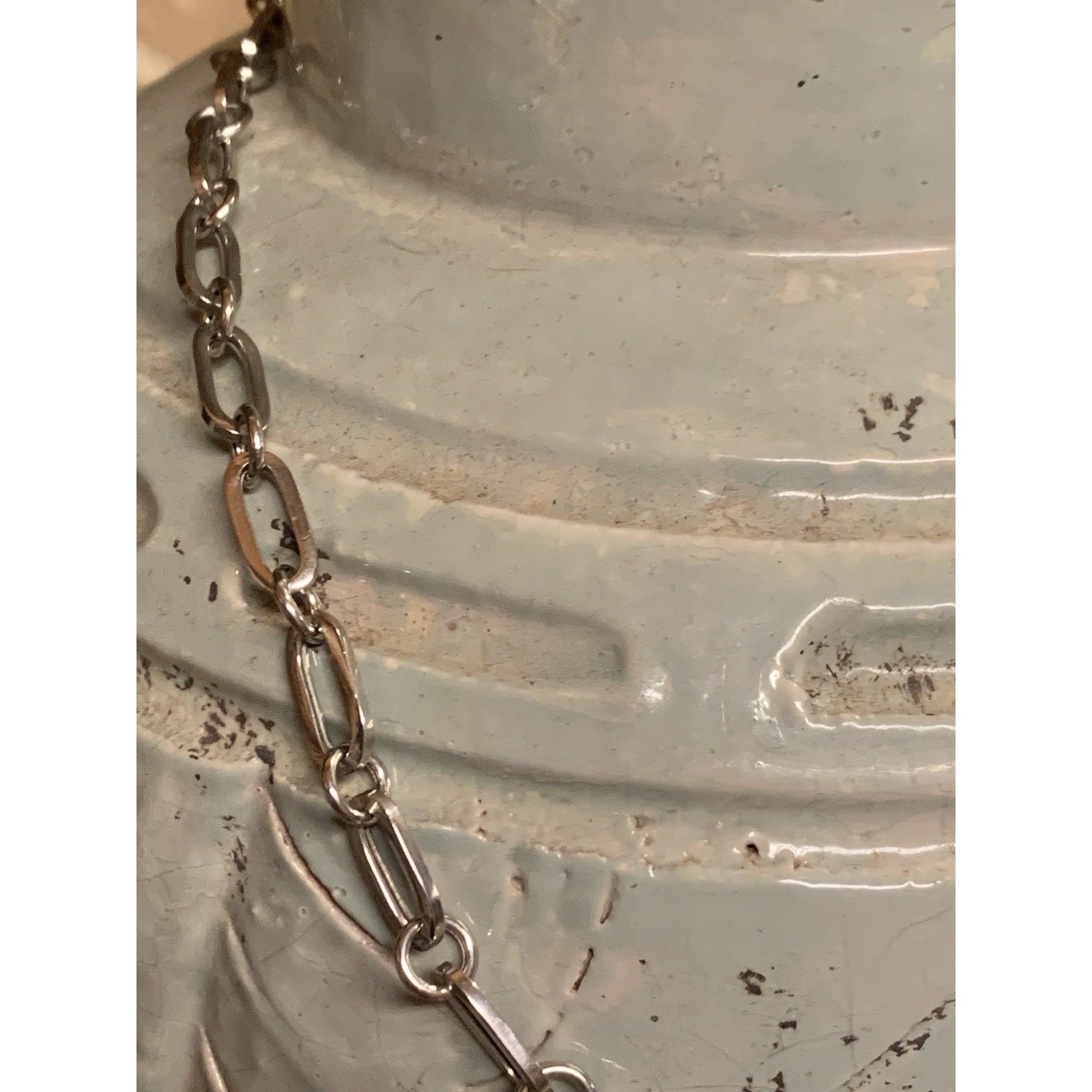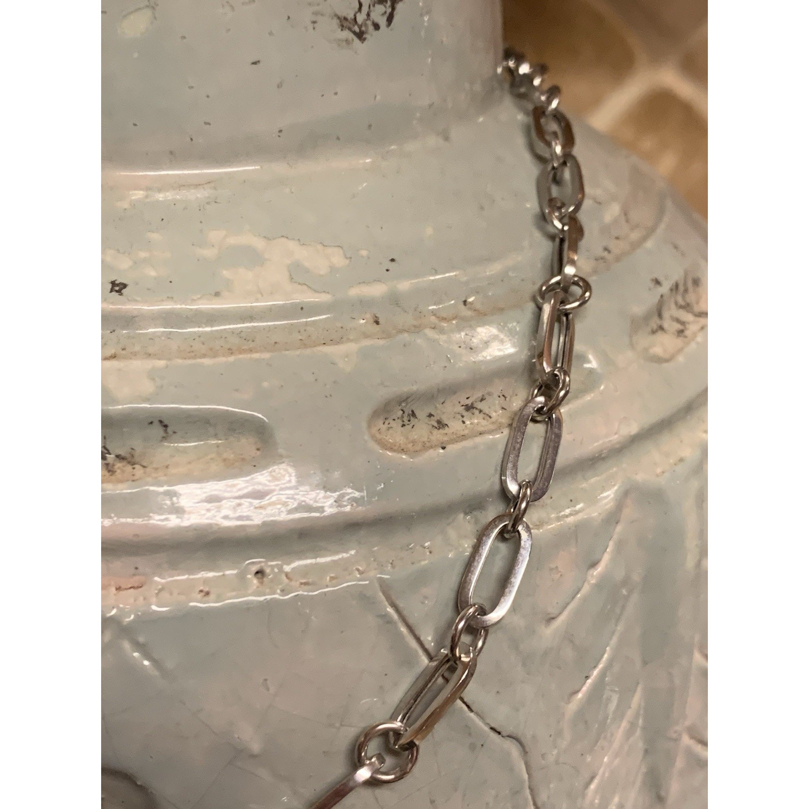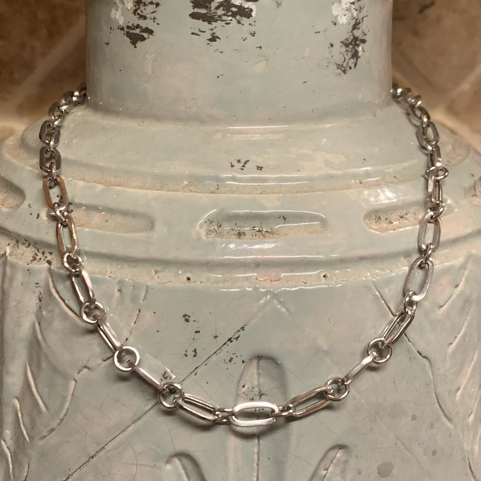 This Italian sterling silver necklace features linked paperclip and round sterling links, with a toggle closure. The 20-inch chain is perfect for various occasions such as engagements, weddings, anniversaries, and birthdays. Made in Italy with 925 sterling silver, this statement necklace is stylish and versatile, ideal for adding a touch of elegance to any outfit. The stackable design allows for easy layering, making it a great addition to any jewelry collection. Made with quality craftsmanship, this necklace is a timeless piece that can be worn for years to come. Marked Italy and 925.