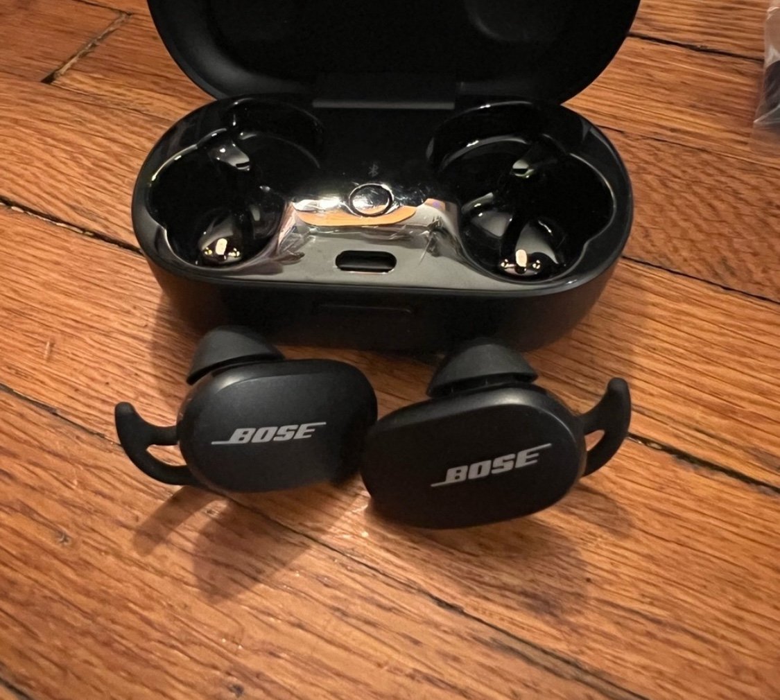 Like new mint condition. No scuffs or scratches. Sound is amazing. I barley used twice. I’m selling because I like how my Dre earbuds work better for me in my line of work. The noise canceling and sound is quality that these have leave my Dre earbuds in the dust. They perform so much better and with a sleeker look. I have all 3 sizes of earbud fittings. I don’t have size 2 bag and I don’t have the original box, because of my good dog. I have the manual charging cable case three ear size plugs that all have been washed and sanitized besides size one has never been opened. I decided that they weren’t for me. Everything works Bluetooth and charging. No charging pod just the Bose charging cable.