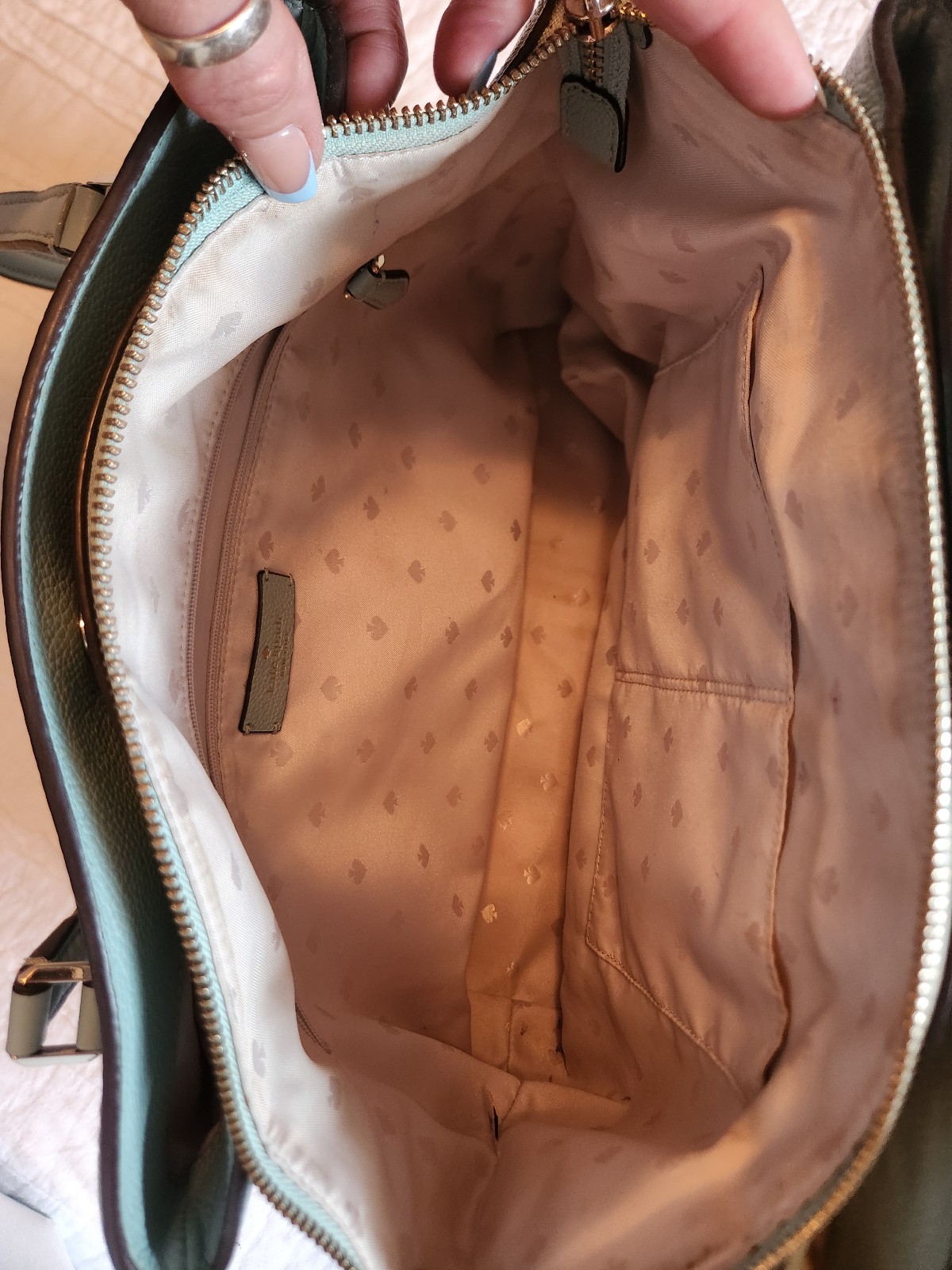 Chic seafoam green tote by Kate Spade. Stylish and versatile for any outing. Three large pockets. Two with magnetic snaps and the center pocket has a zipper. Inside the small zipper pocket are some black marks. Handles have a little wear, as shown. Otherwise, the purse is in really good condition. Please see all pictures for more details.