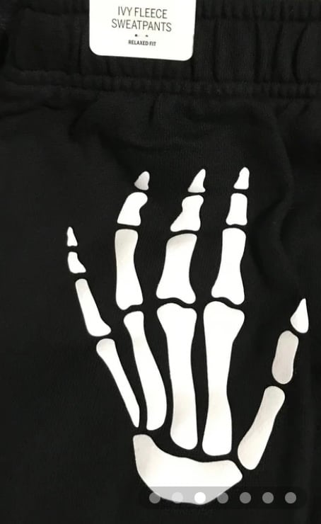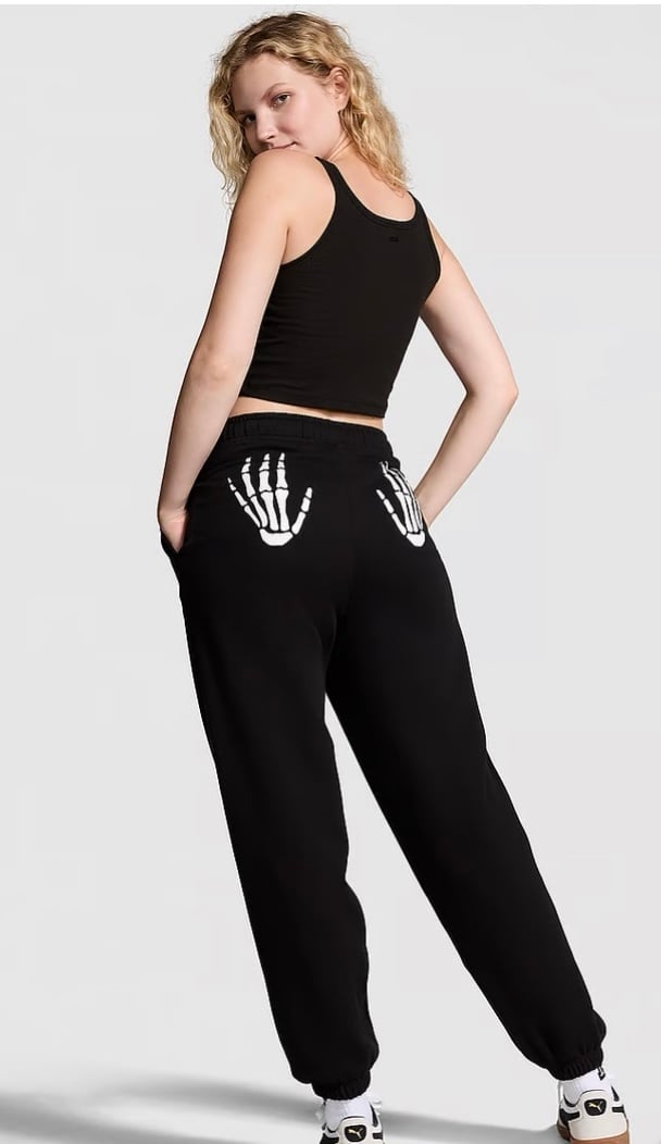 Pure black OVERSIZED Campus Sweatpants, high rise, elasticized waist with drawstring, side pockets, and white skeleton hands on the back.