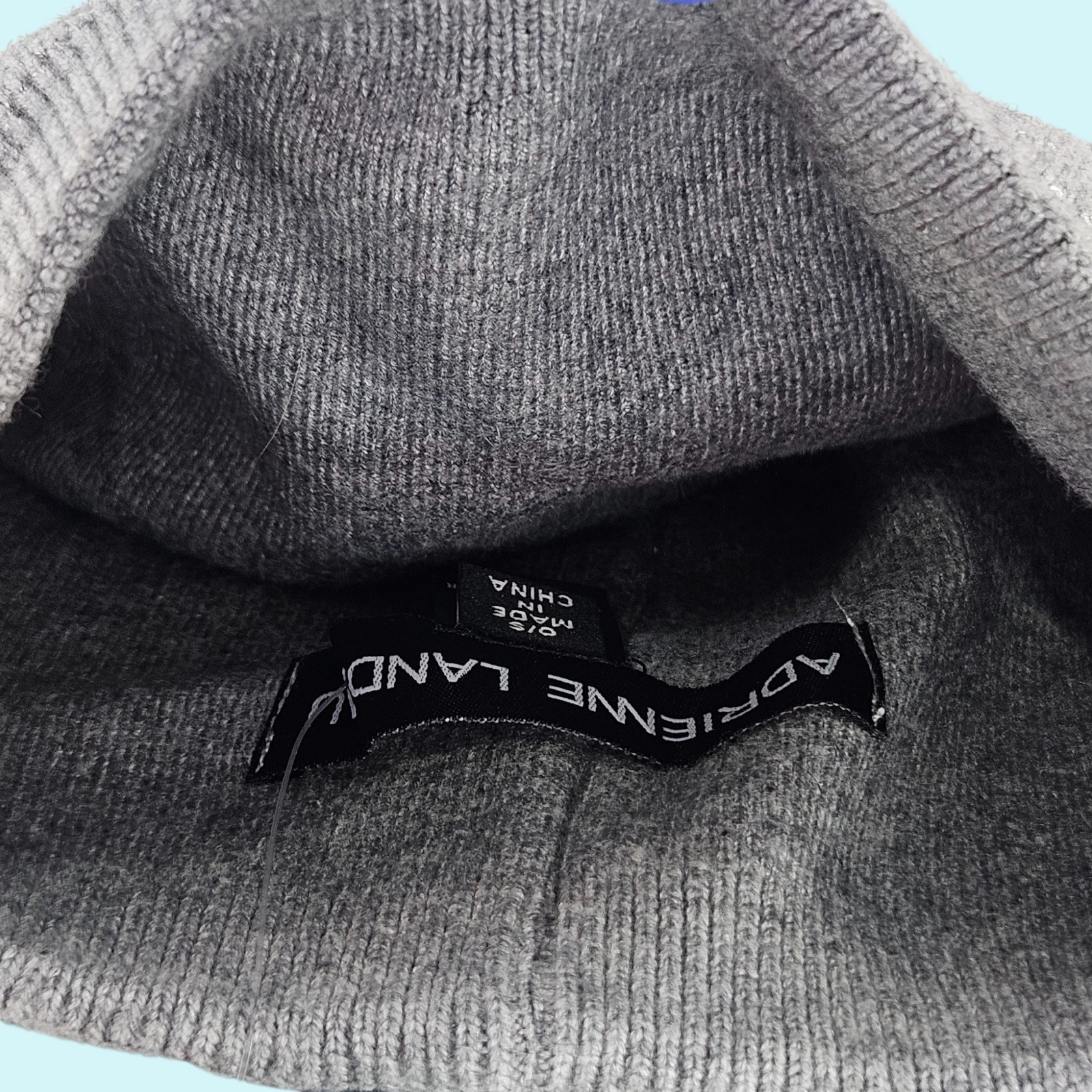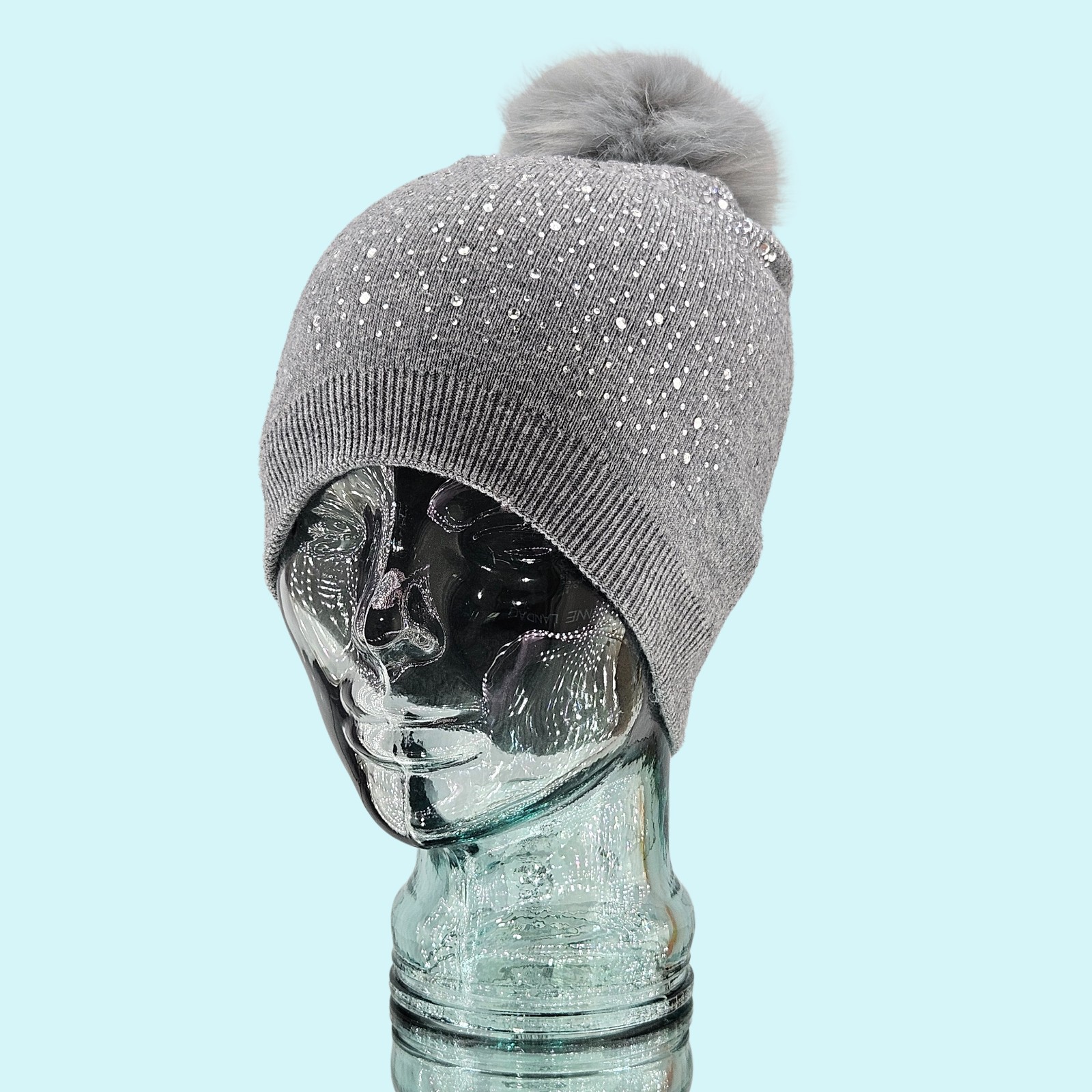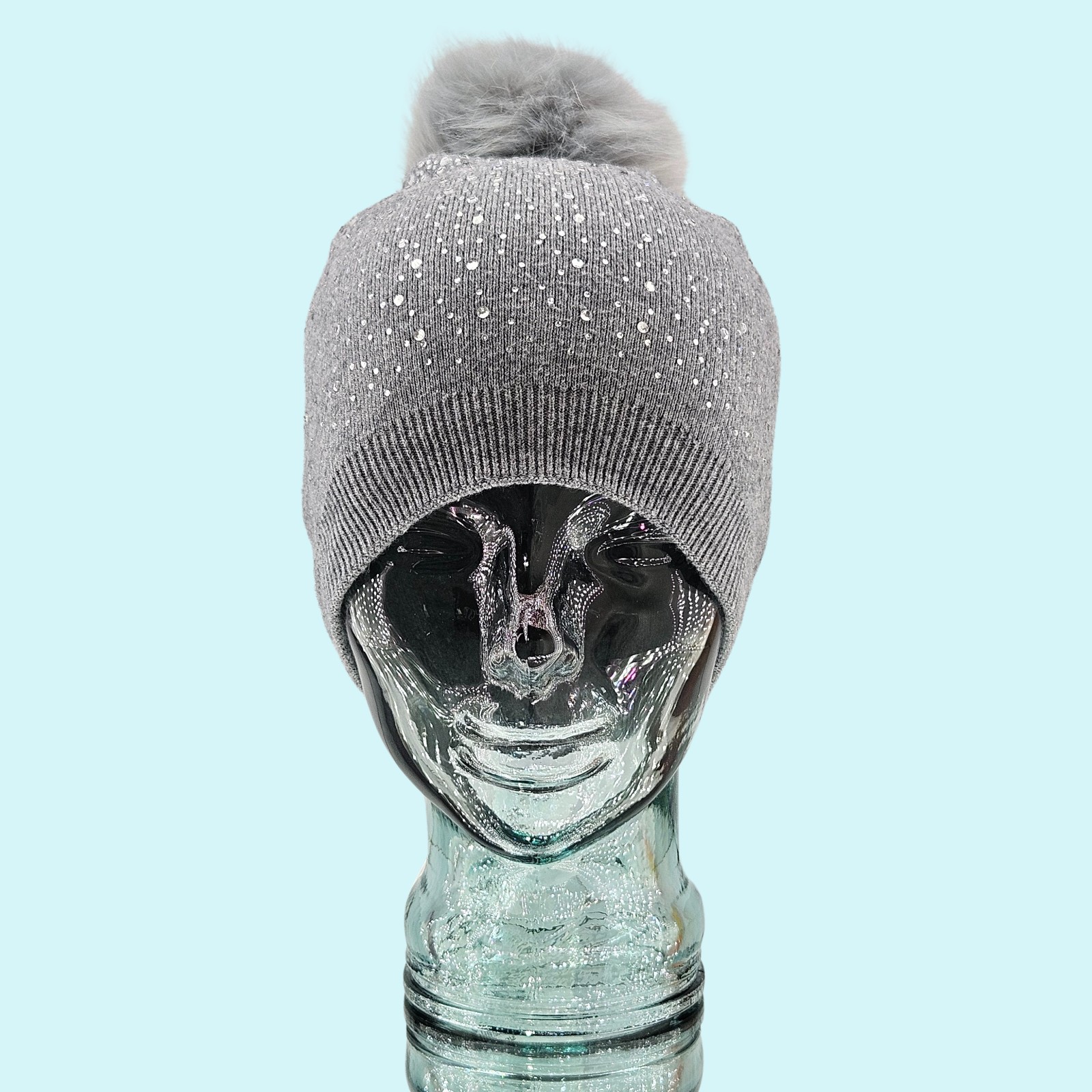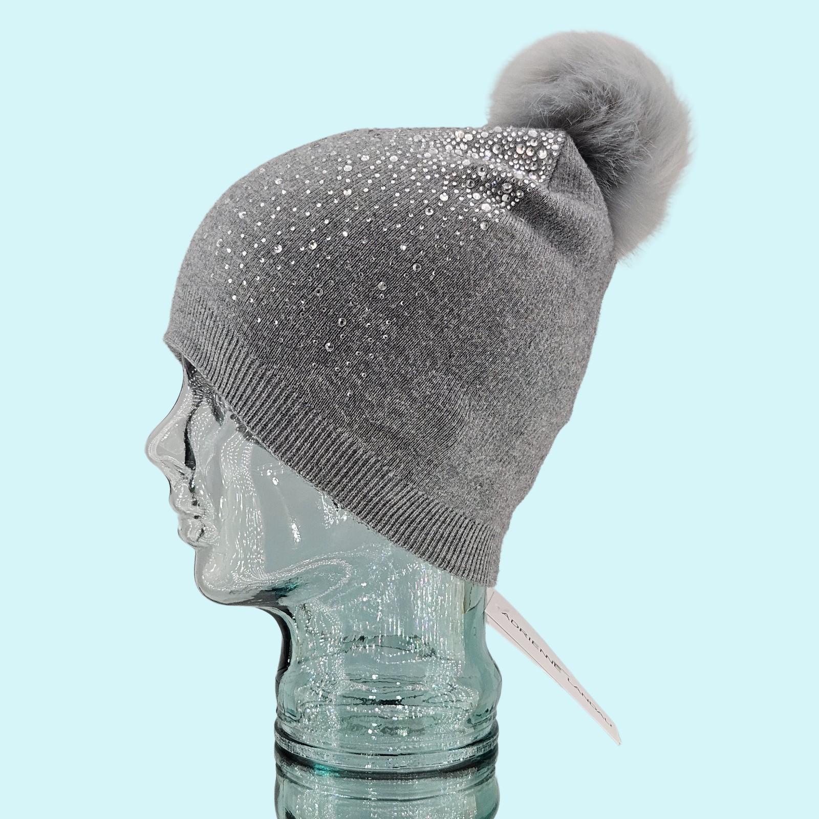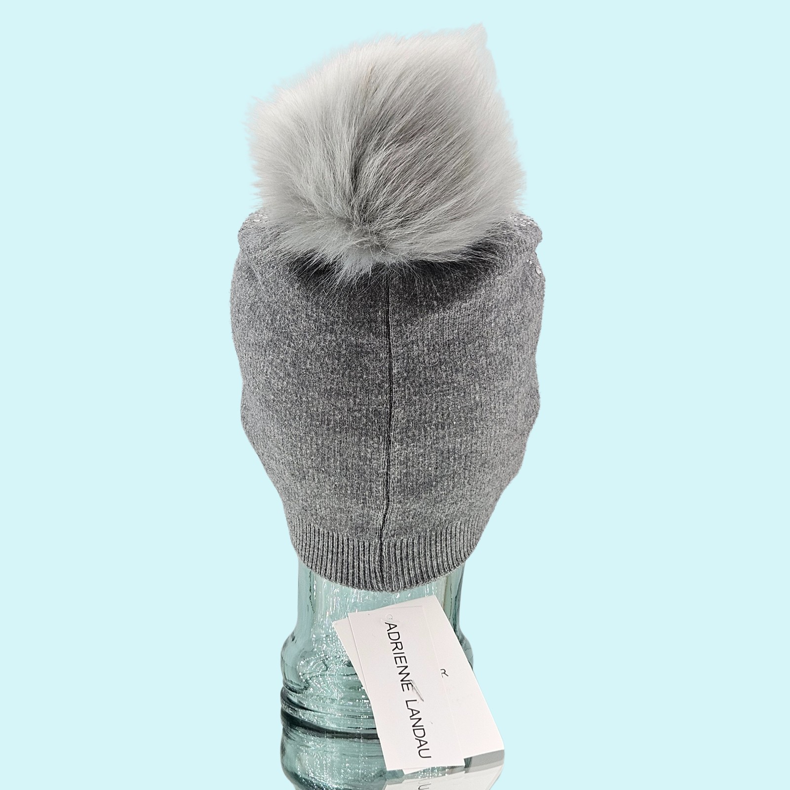 Adrienne Landau Hat Beanie Grey Studded Rhinestone Faux Fur Wool Blend Holiday