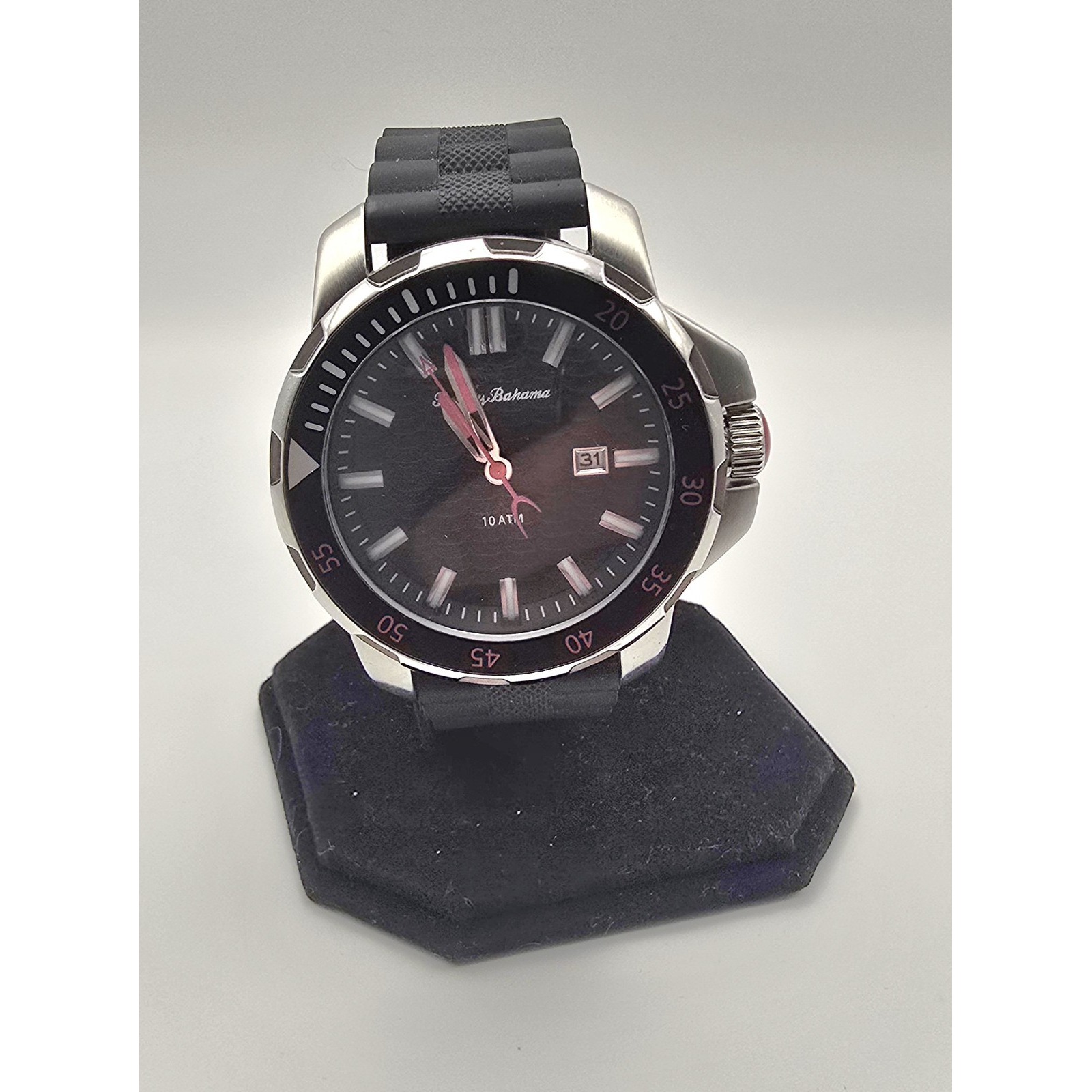 The TOMMY BAHAMA Big Island Diver Watch TB1297 A126 is a stylish men's wristwatch designed for diving enthusiasts. Featuring a quartz movement, this watch is water-resistant and comes with a date indicator, seconds hand, and 12-hour dial. The brown case and black dial set off by the black band give the watch a sleek and sophisticated look. Complete with original box, papers, and a manual, this Tommy Bahama watch is a perfect choice for those looking for a reliable timepiece that can withstand the demands of underwater activities.