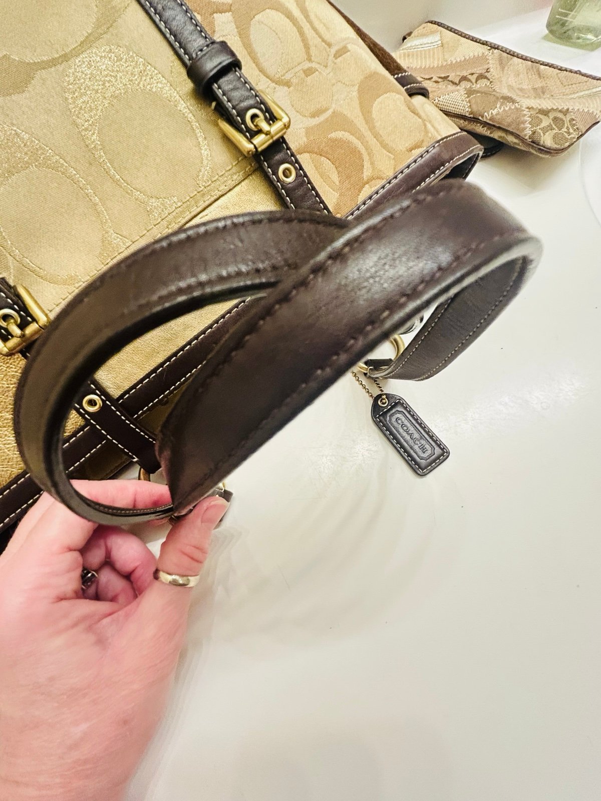 With a Darker Tan / Rich Brown in color Coach Signature kissing C's that's around the bag