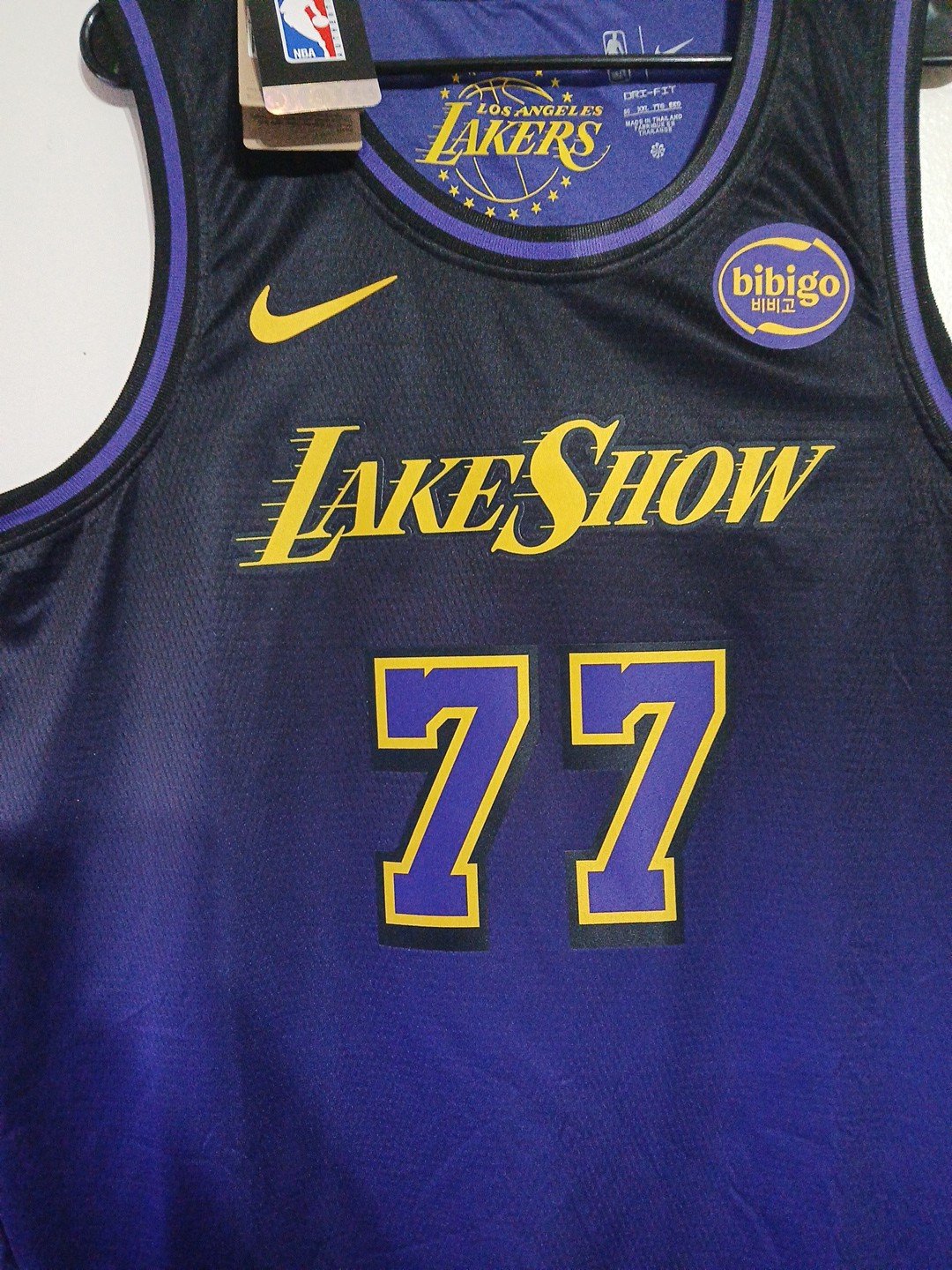 The product is a Nike Luca Doncic Los Angeles Lakers Laker Show jersey in purple, size 2XL for men. It is officially licensed by the National Basketball Association (NBA) for the Regular Season. The jersey features Luca Doncic's name and number for the Los Angeles Lakers team.