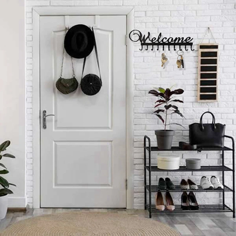 Stylish & Convenient - This eco-friendly key rack provides a country rustic or modem style to decorate your indoor spaces while made firmly and durably for reliable uses. A sleek, black design, metal "WELCOME" wall art will add a touch of modern style to your entryway, it can be mounted anywhere you want to keep your keys more organized.