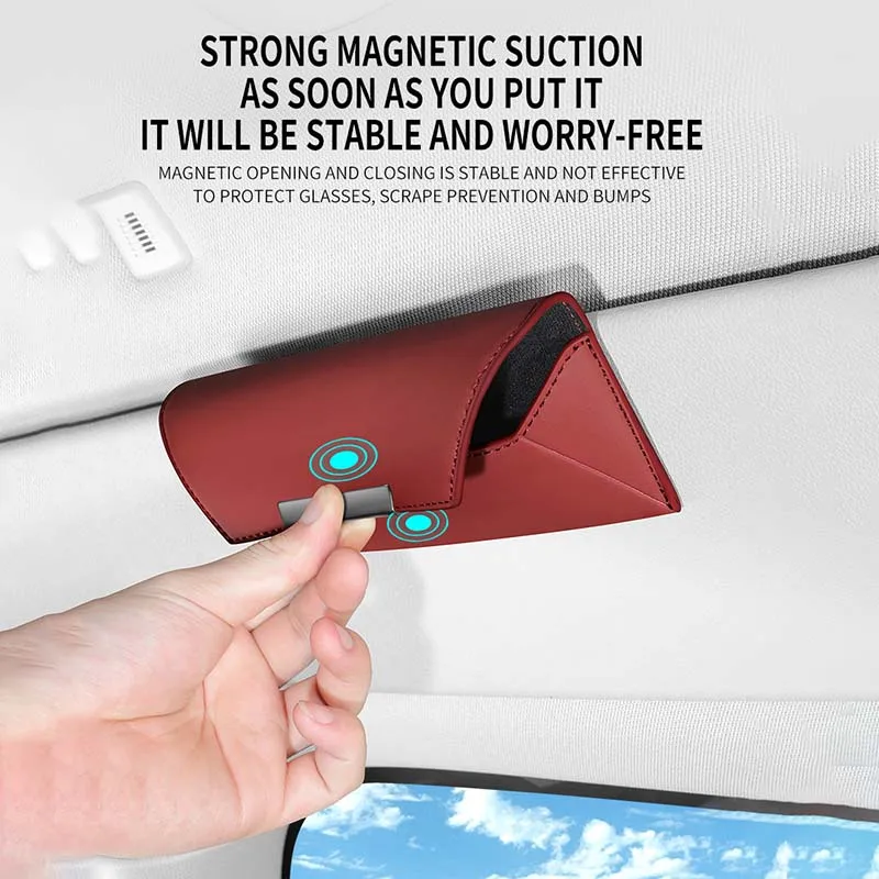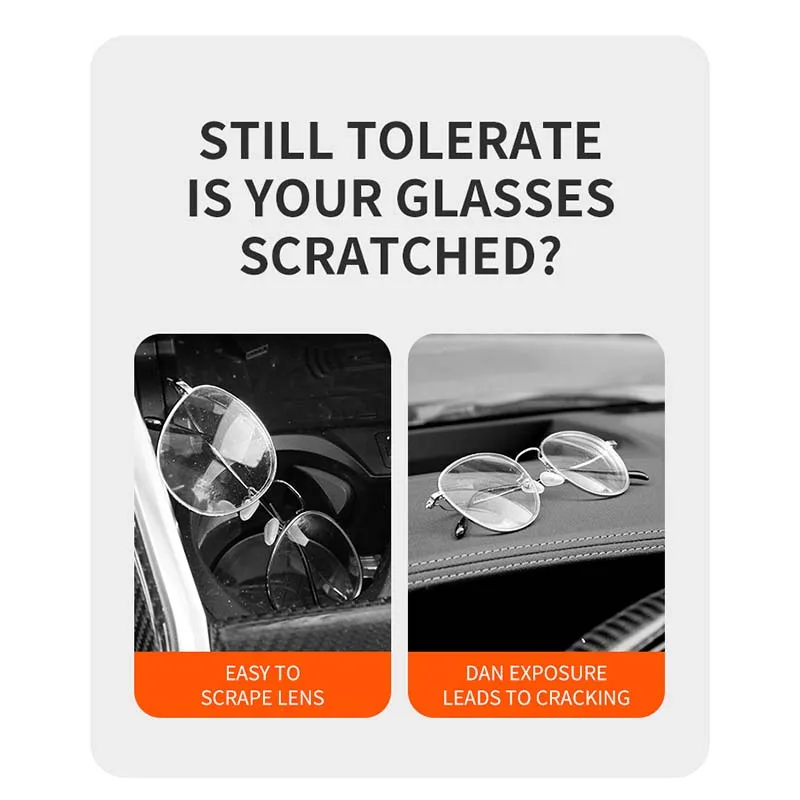 ""Tired of scratched lenses and messy car interiors? Our holder keeps your glasses SAFE, ACCESSIBLE, and STYLISH. Choose your favorite color today!"" "