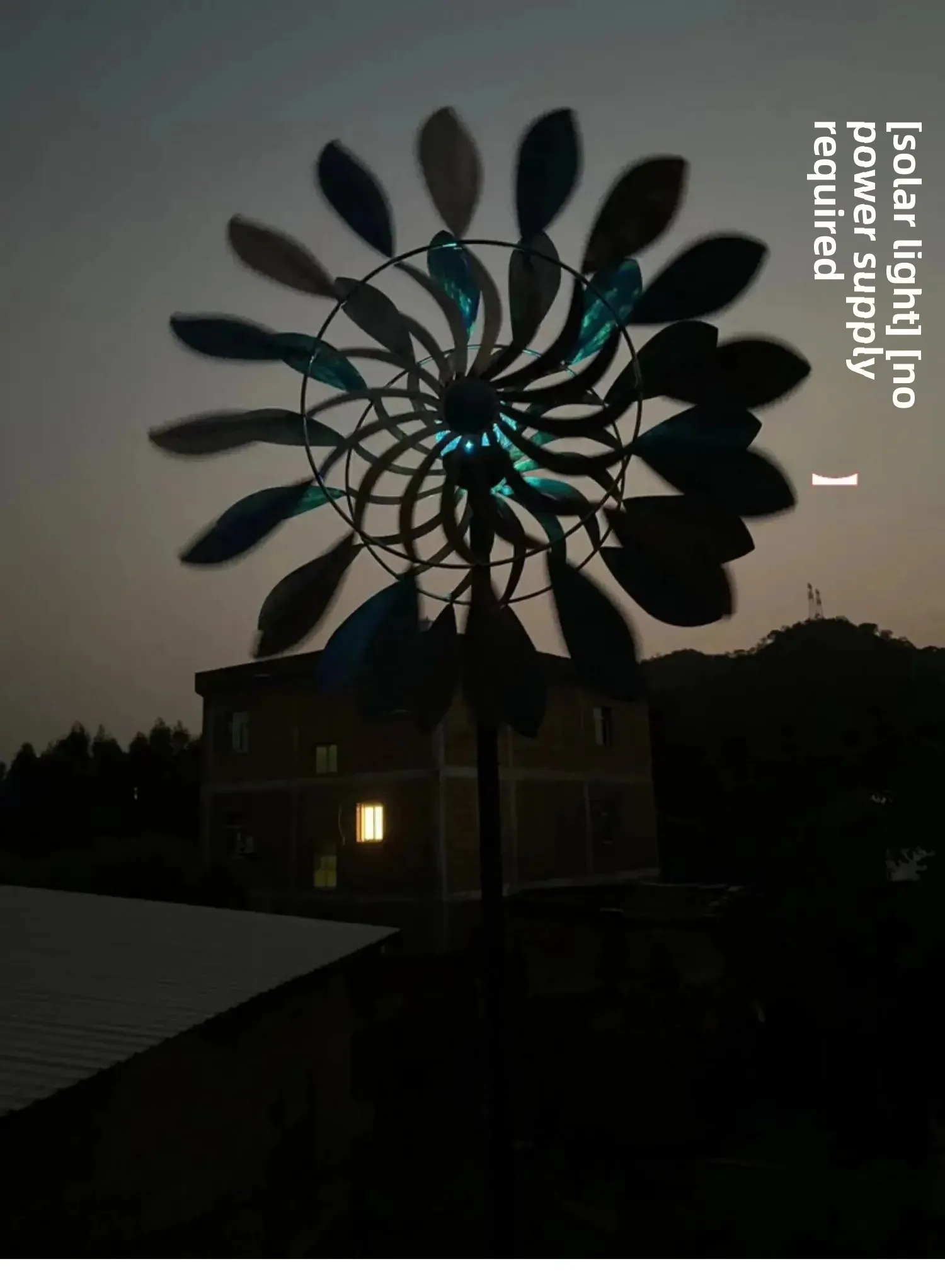 Colorful LED Windmill– Large solar-powered wind spinner glows with vivid rotating lights at night.