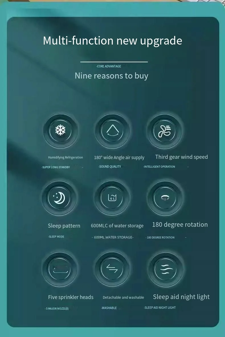 4.Water Mist Function: The built-in misting feature helps to refresh the air and keep your surroundings cool and humidified, ideal for dry environments or hot summer days.