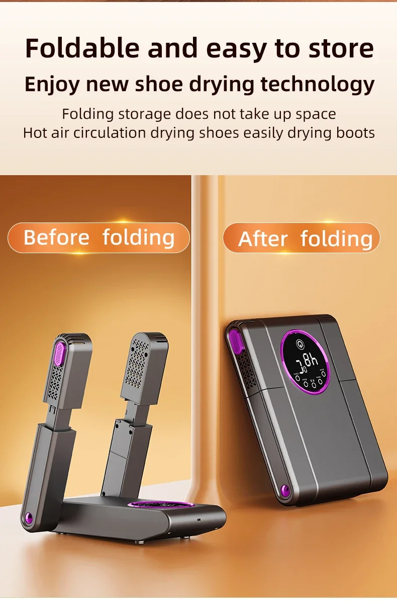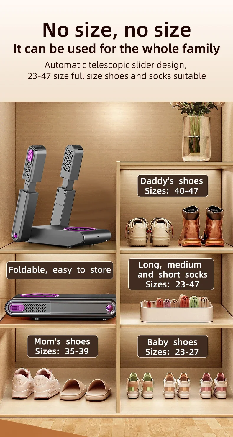 Say goodbye to wet, uncomfortable shoes with the shoe dryer! Experience the difference of our innovative retractable and bendable drying port that reaches deep into the toe box of your boots. The 180° foldable drying rack accommodates footwear and gloves of all sizes and shapes. Keep your shoes and boots dry and comfortable with this innovative and easy-to-use dryer.