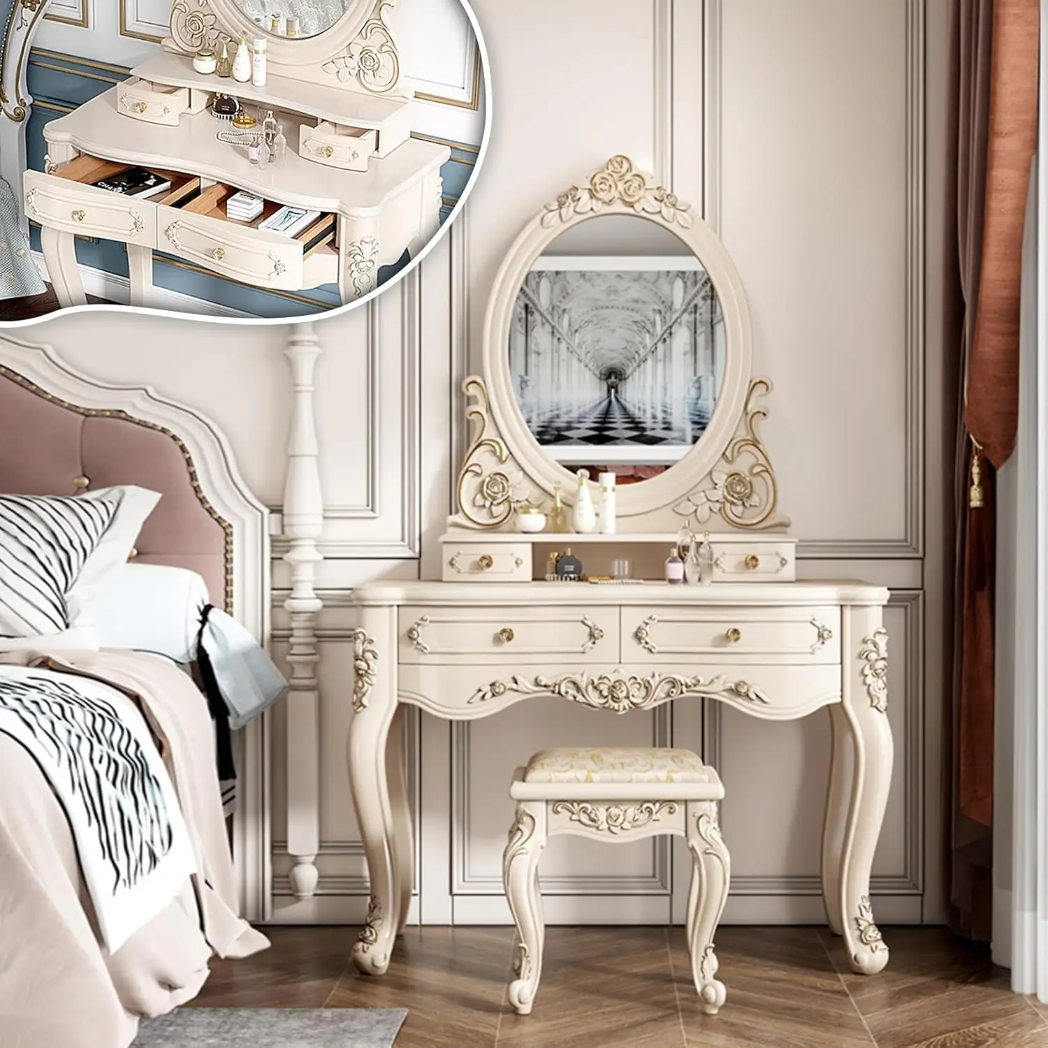 1. Elegant Vintage Design: This Vintage Vanity features a beautifully crafted wood finish, making it an ideal modern makeup vanity set for any bedroom. Its vintage Victorian style adds a touch of coquette charm to your space