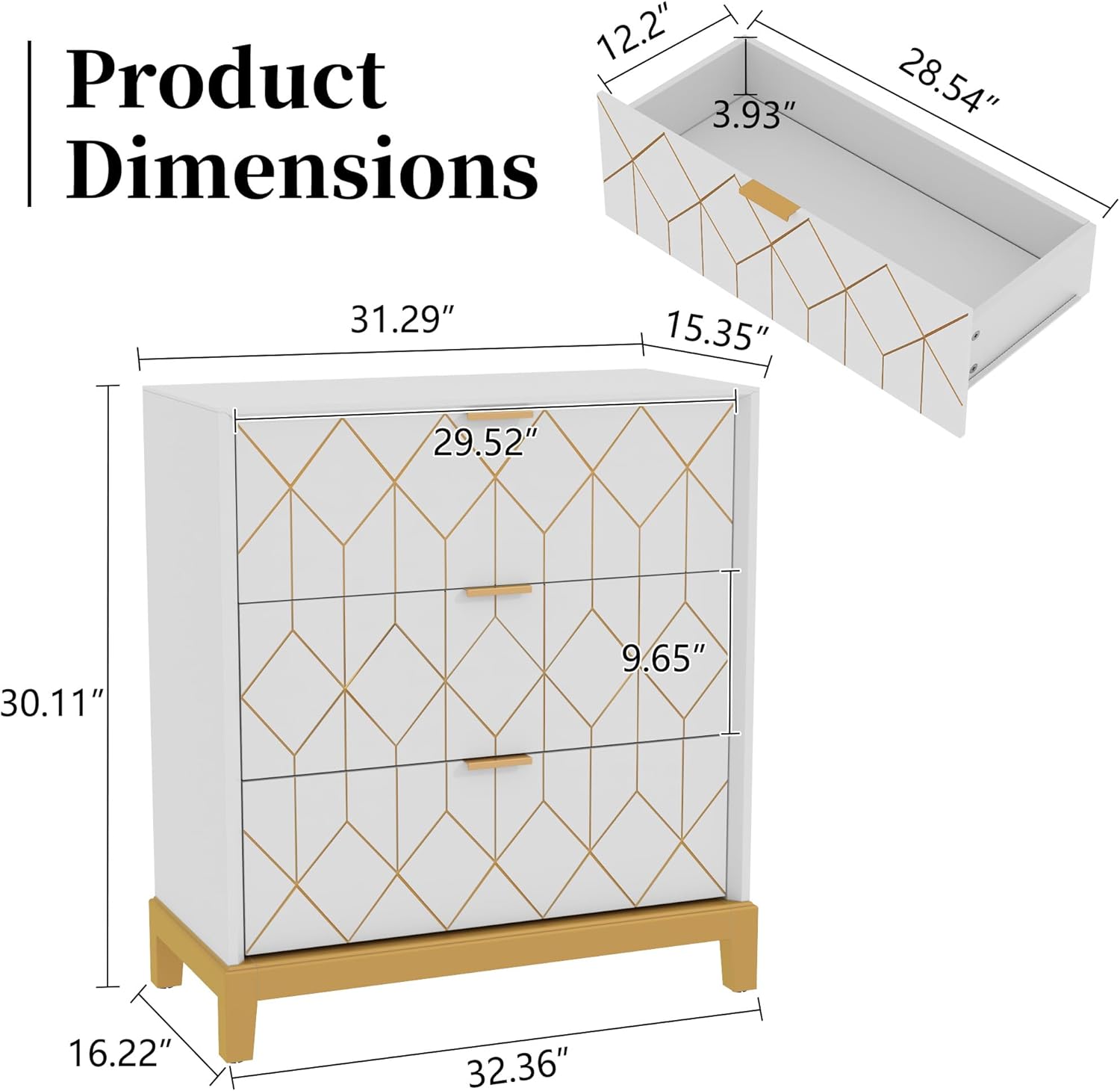 3 Drawer Dresser For Bedroom, Modern Wood Chest Of Drawers With Gold Trim, Accent Dresser Storage Tower, White Organizer