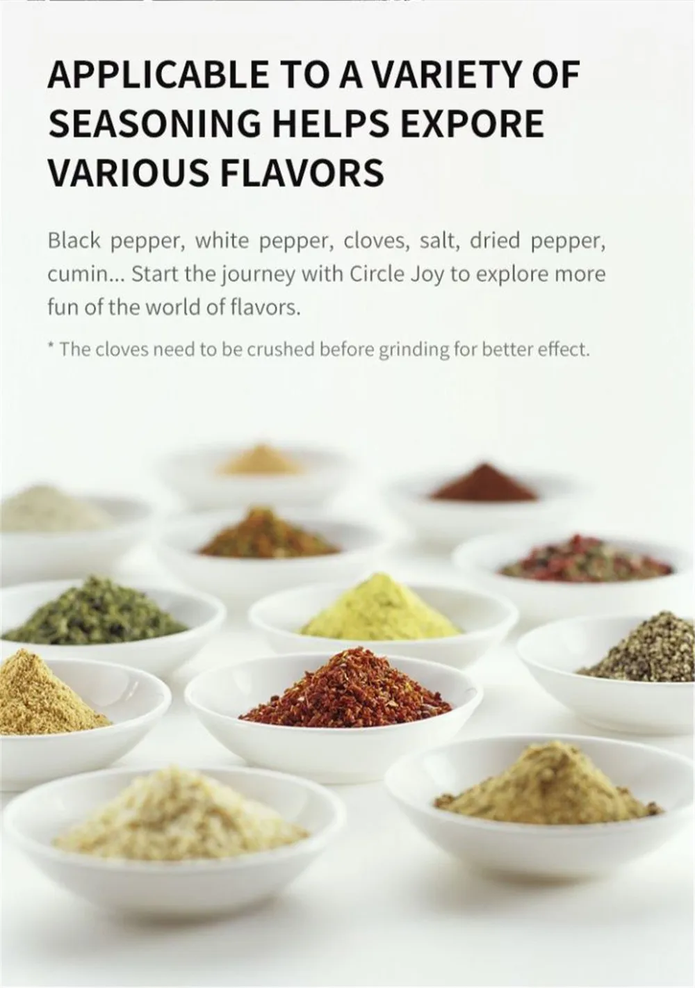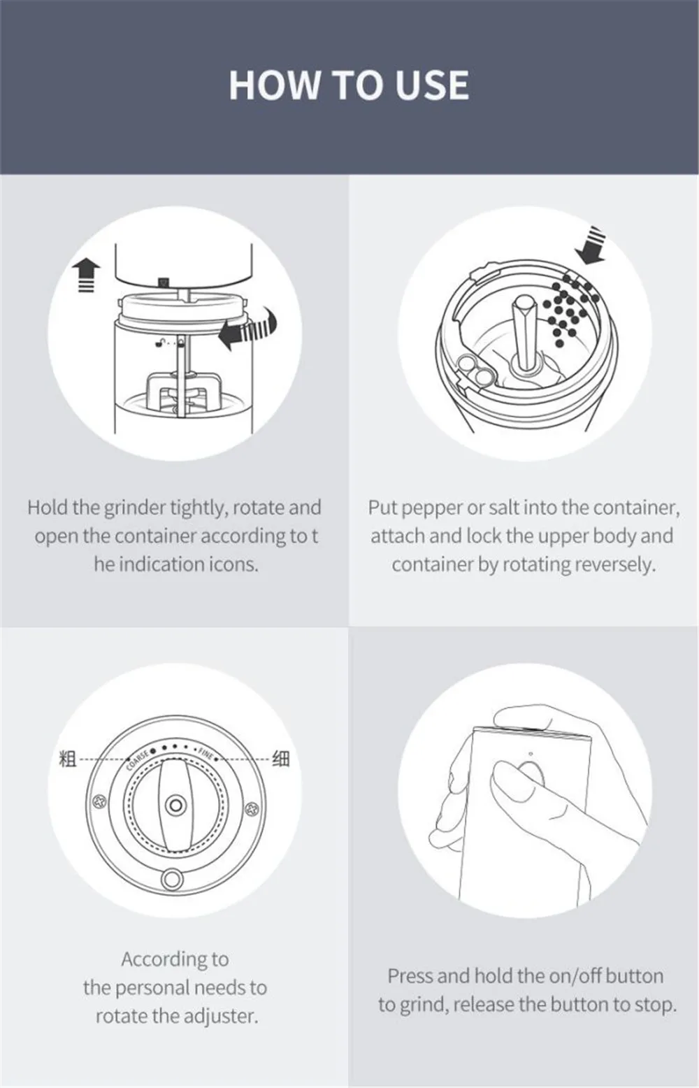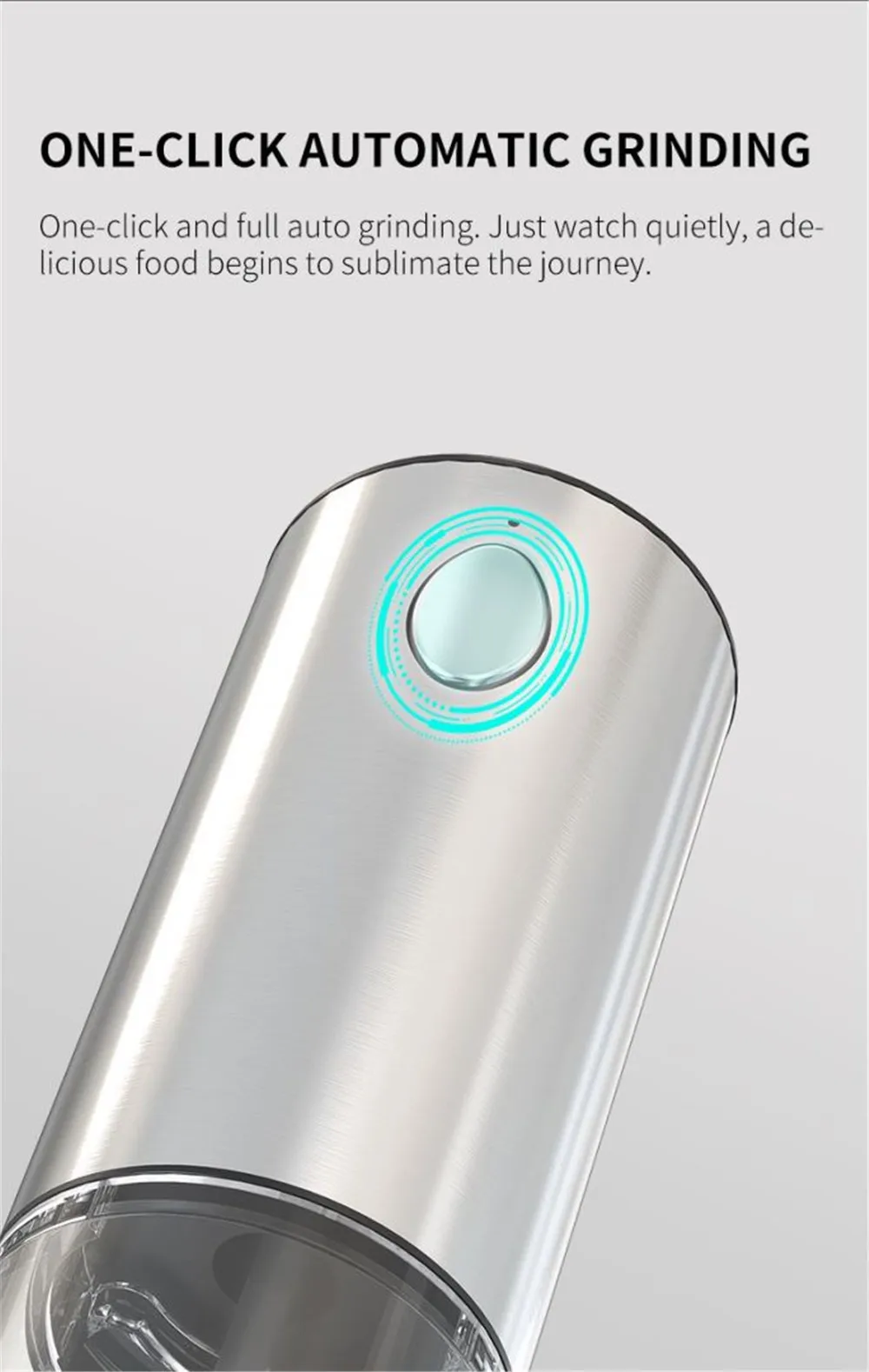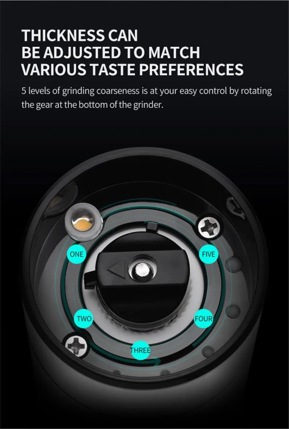 CONVENIENT OPERATION: No twisting required! Simply press the on/off button for easy grinding. A soft white LED light automatically turns on when the grinder is in use, illuminating and accurately seasoning your food. It stops working immediately after releasing the button for precise dosage control.