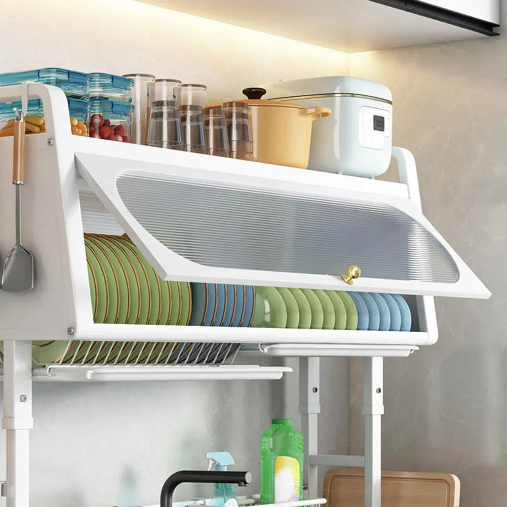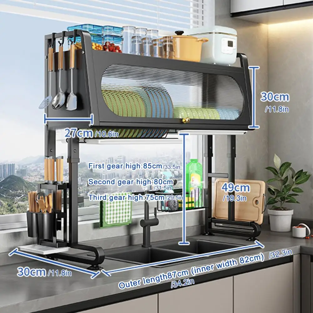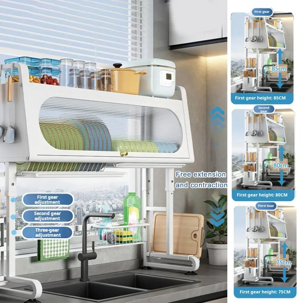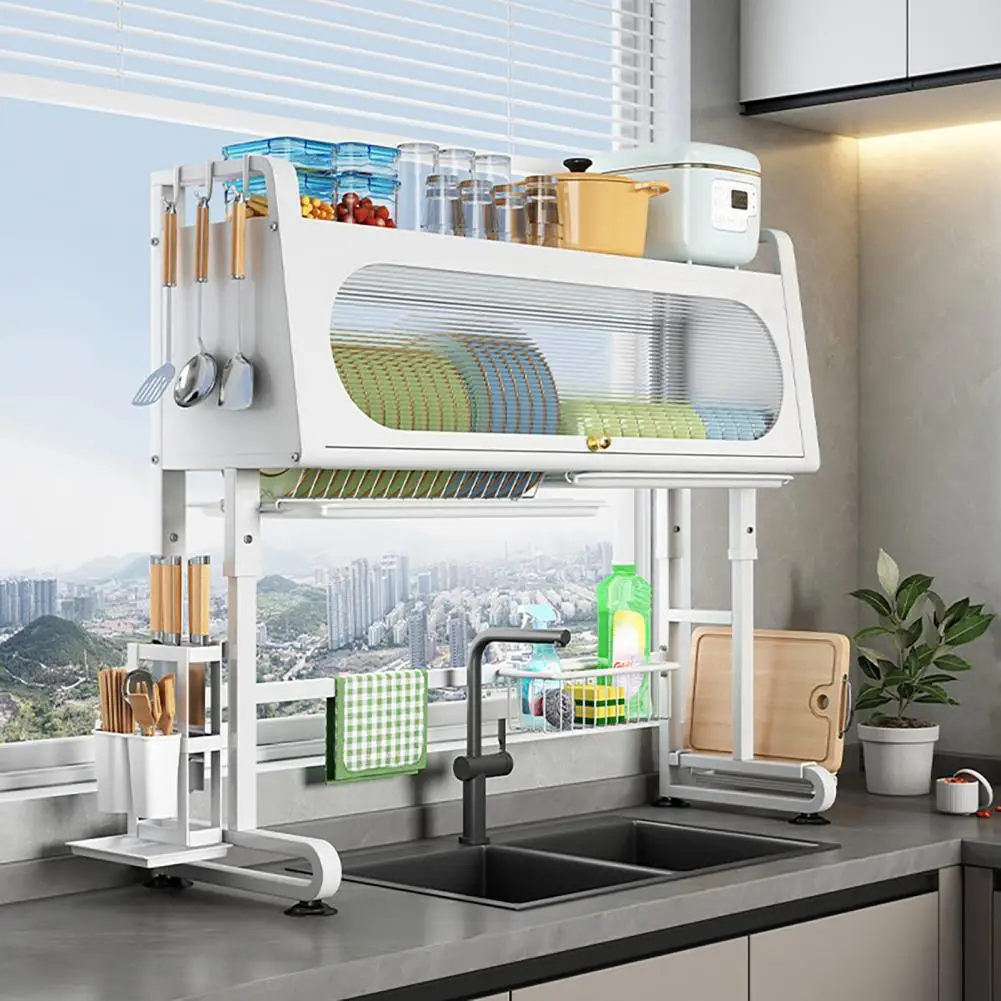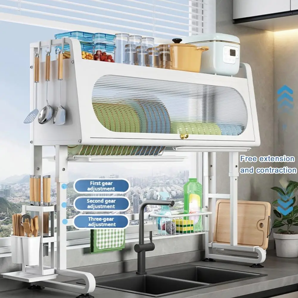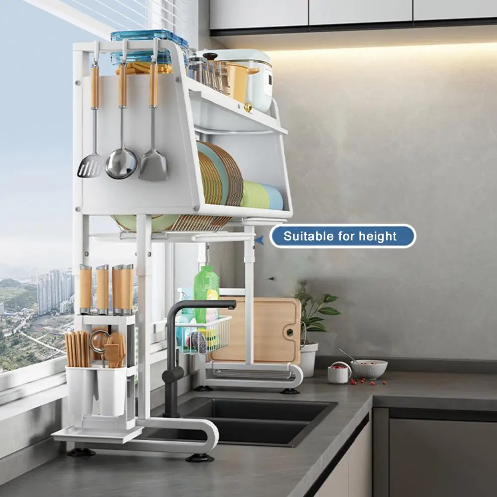 Sink Rack Adjustable Height Dish Plate Bowl Drying Rack with Tableware Holder And Hooks Kitchen Storage Shelf Stable Chopping Board Holder Sink Organizer
