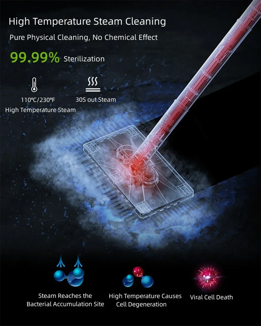 EASY AND SAFE TO USE: Adjustable steam, rotating mop head, efficient cleaning mop pad, suitable for repeated cleaning. The extended aluminum pole and extra-long power cord, (standard 3M/10FT) allow you to quickly and easily clean hard-to-reach areas. Ultra-thin design, small and delicate, durable plastic case, does not use harsh chemicals, perfect for any family with children and pets.