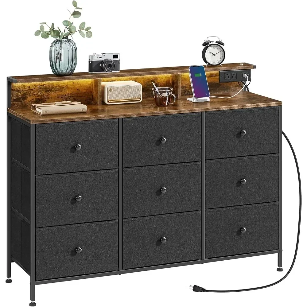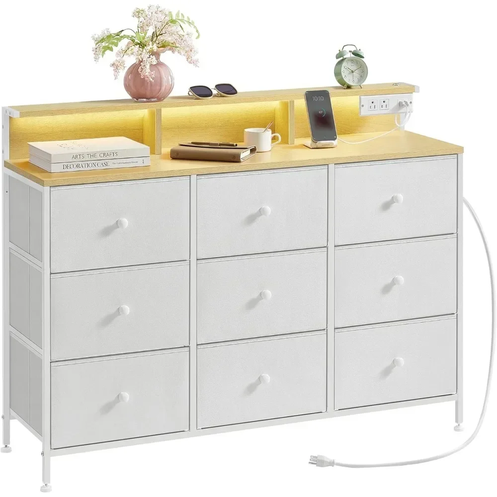 Dresser for Bedroom, Storage Organizer with 9 Fabric Drawers and LED Lights, Charging Station, Steel Frame, 13.2 x 44.9 Inches