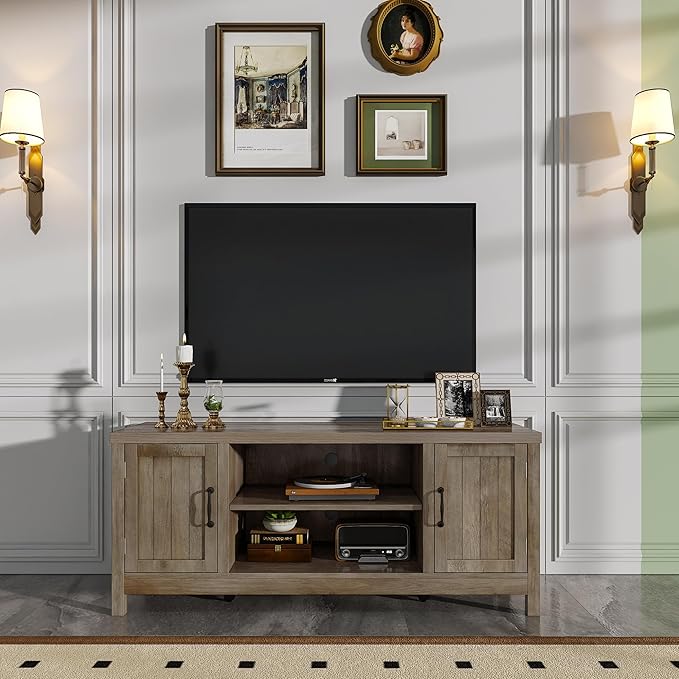Farmhouse Tv Stand, Wood Grooved Door Entertainment Center With Storage Cabinets And Open Shelves, Rustic Media Console Up To 55 Hes For Living Room, Bedroom, Grey Wash