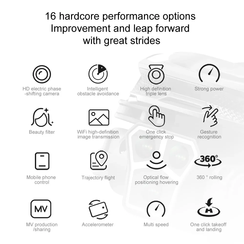 6. Gesture photography, optical flow positioning, brushless motor, super long battery life, obstacle avoidance gimbal components, stop without collision when encountering obstacles