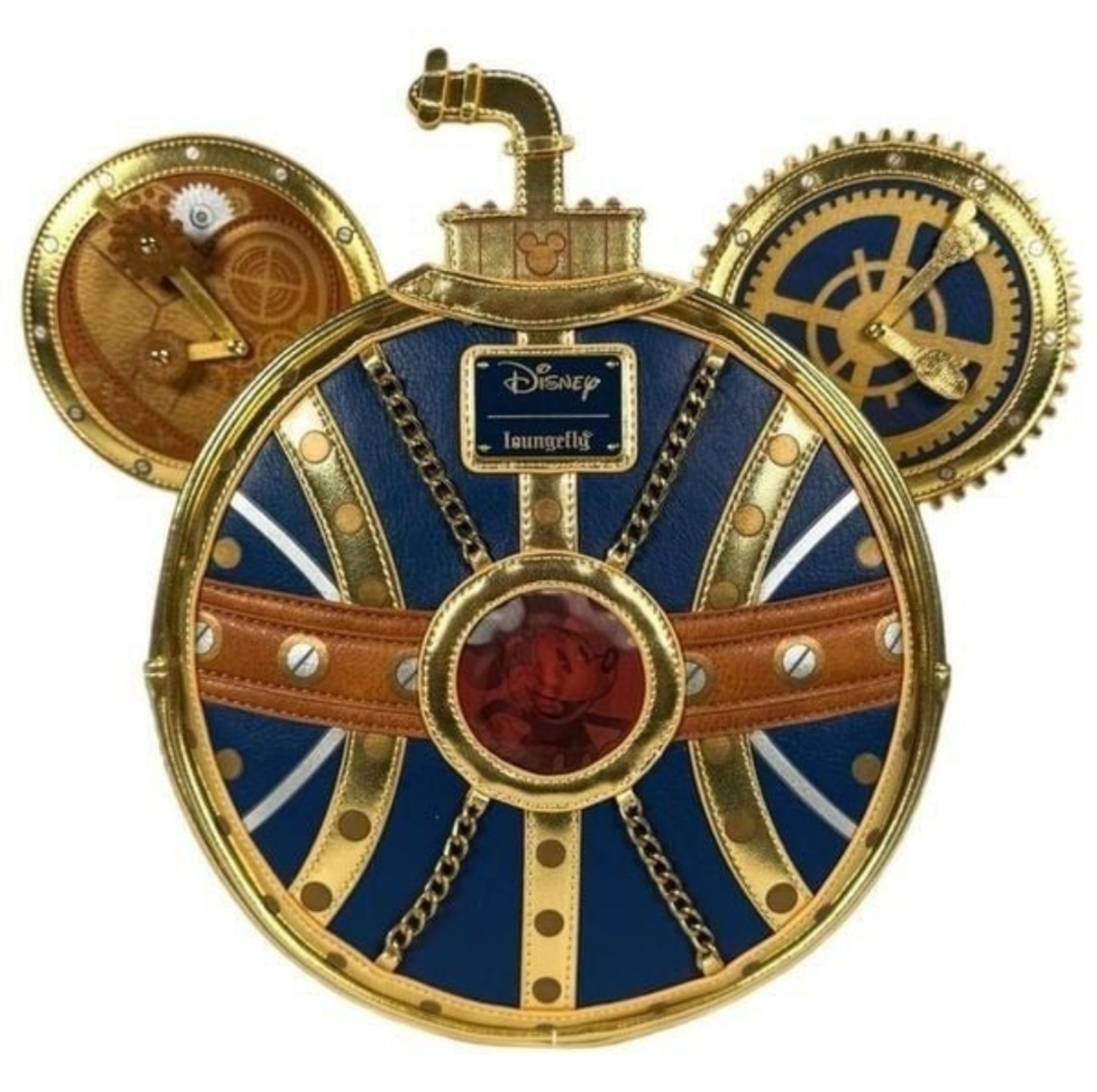 Classic Disney meets Steampunk funk! This EXCLUSIVE Mickey fiqural head bag is over flowing with intricate details! It screams steam boat captain with its rivets and cogs of a long lost age of steel. Yet, it's bursting with bold hues of blue and gold that scream elegance in a unique steam punk fashion. Moving parts, real metal, a lenticular Mickey center, and a beautifully crafted gold zipper pull make this bag a standout in ANY collection!