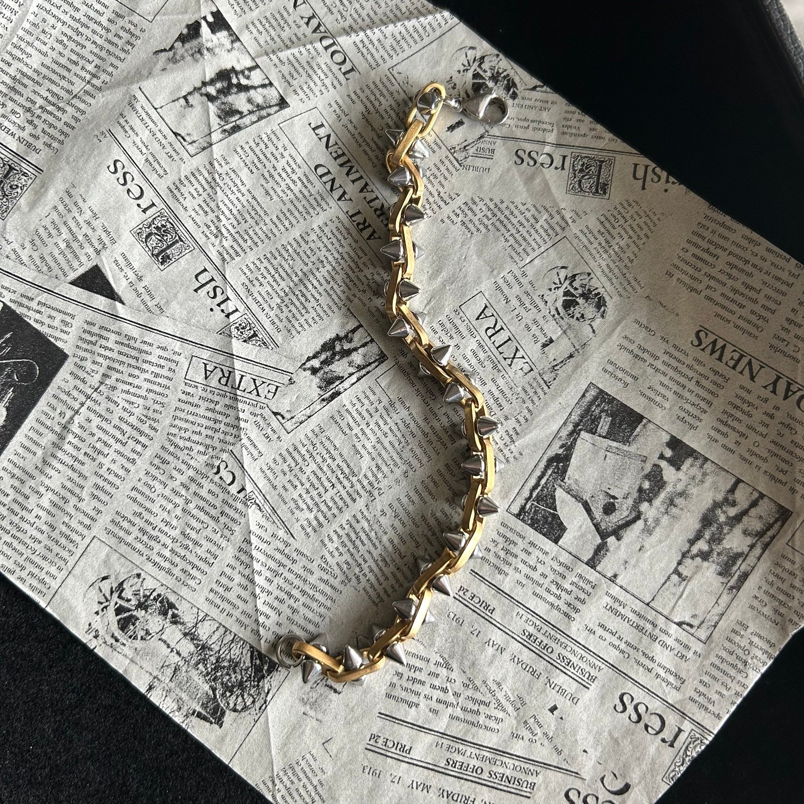 Beautiful heavy duty bracelet with gold links and double silver spikes. Each link has two spikes.