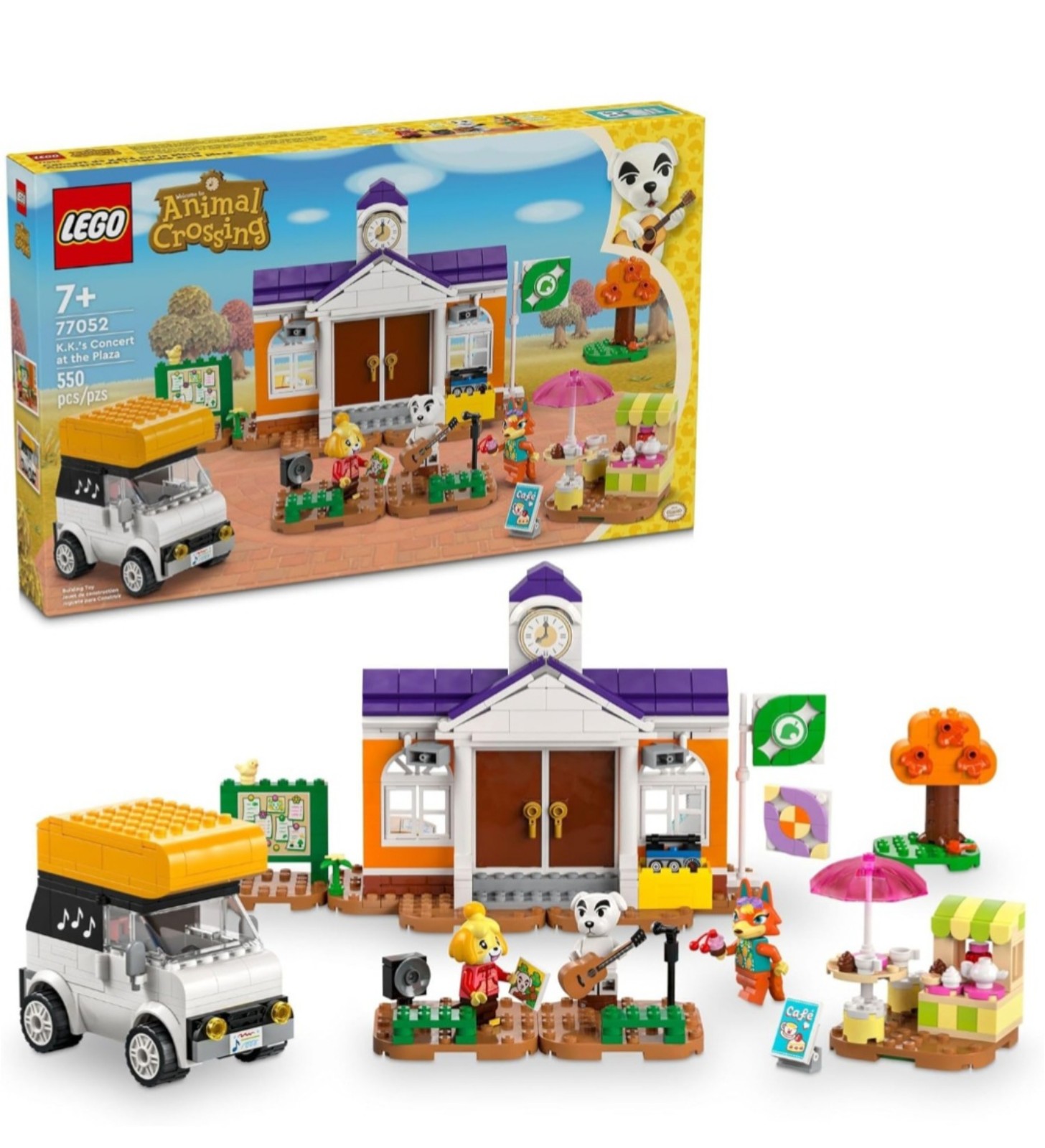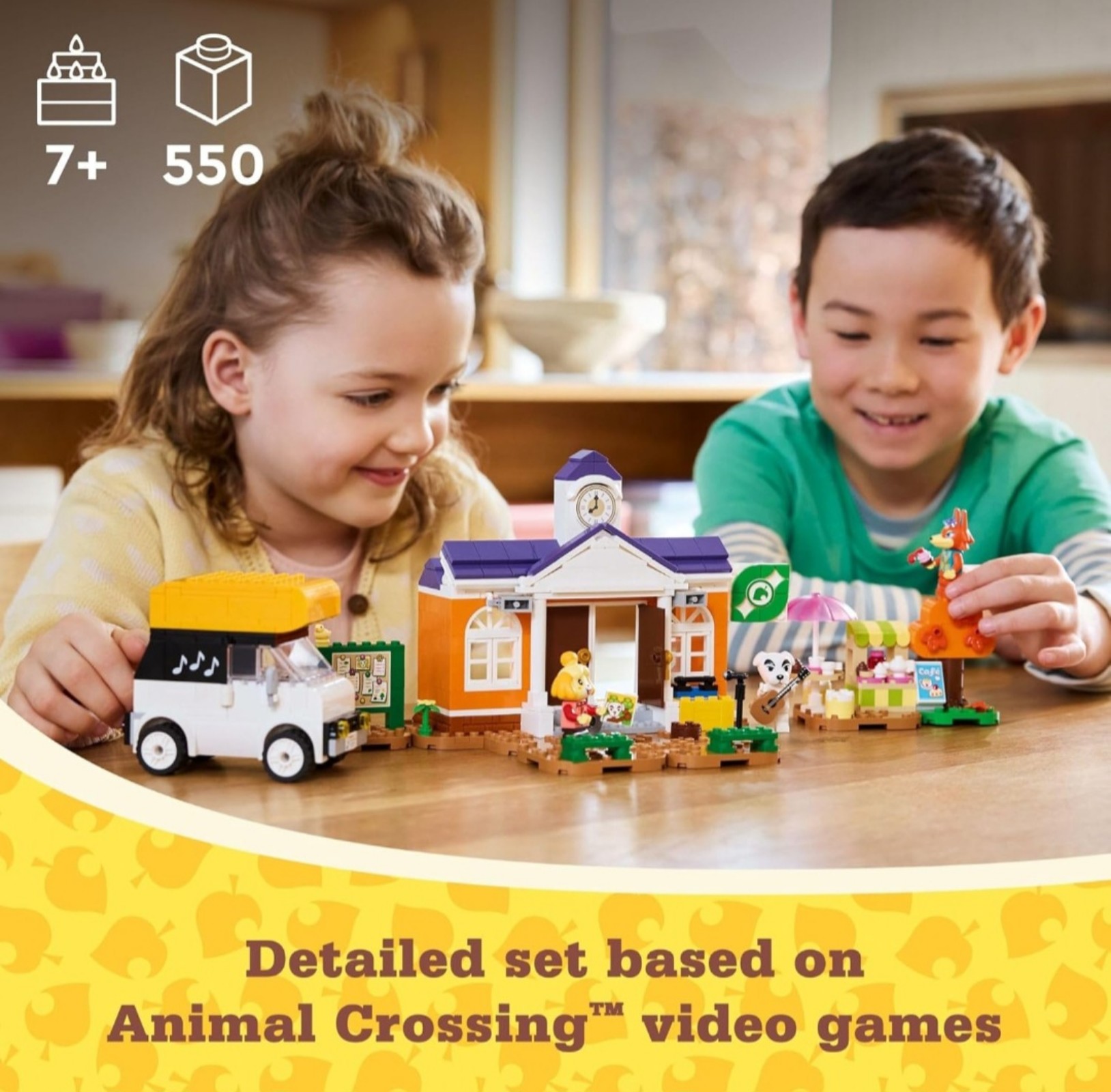 With 3 recognizable Animal Crossing characters – This brick-built playset includes K.K., Isabelle and Audie minifigures, a model of Resident Services with a café and a drivable camper car toy