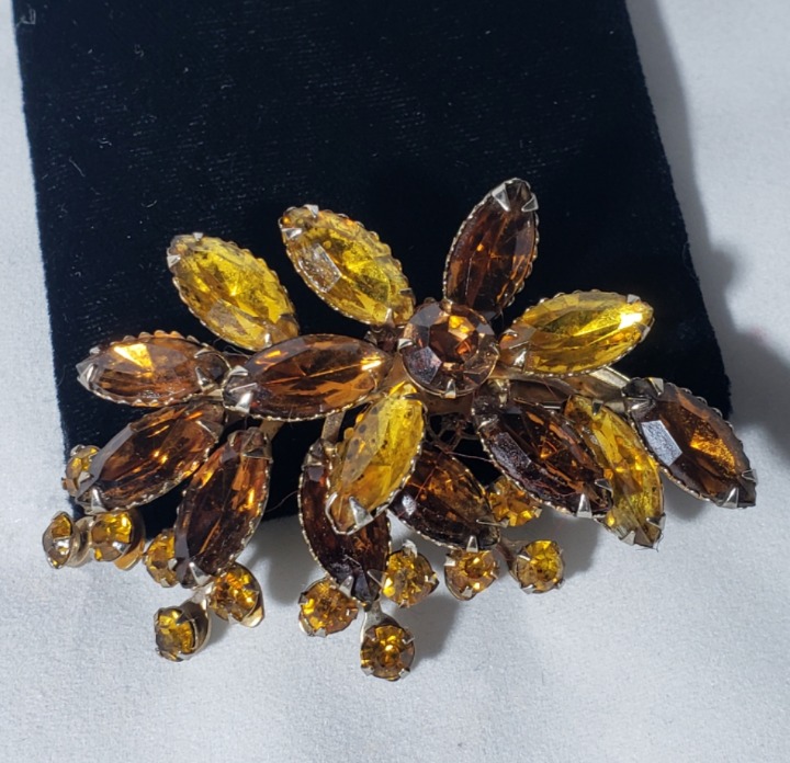 VINTAGE FLORAL SPRAY FACETED PEAR SHAPED AMBER RHINESTONE BROOCH