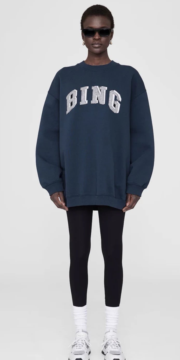 The Tyler Sweatshirt is an oversized crewneck pullover made from heavyweight, navy cotton fleece. It features a layered felt patch graphic in grey and ivory collegiate lettering with a ANINE BING logo at the chest for an athletic-inspired look. This style is finished with ribbed trim at the collar, cuffs, and hem.