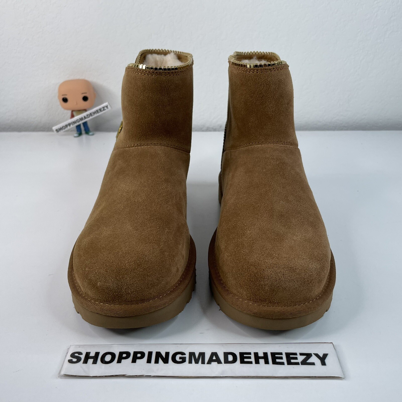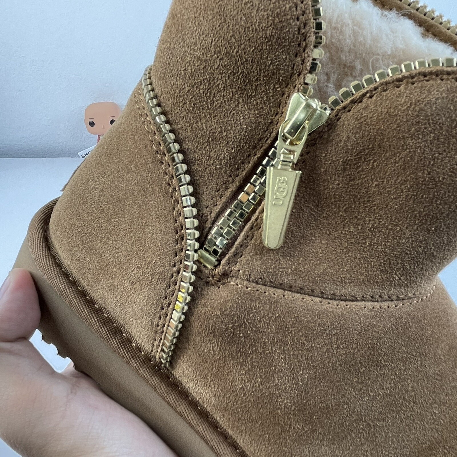 [Wm 8] UGG Classic SHORT FLORENCE Chestnut Suede Sheepskin Boots Gold Zipper Zip
