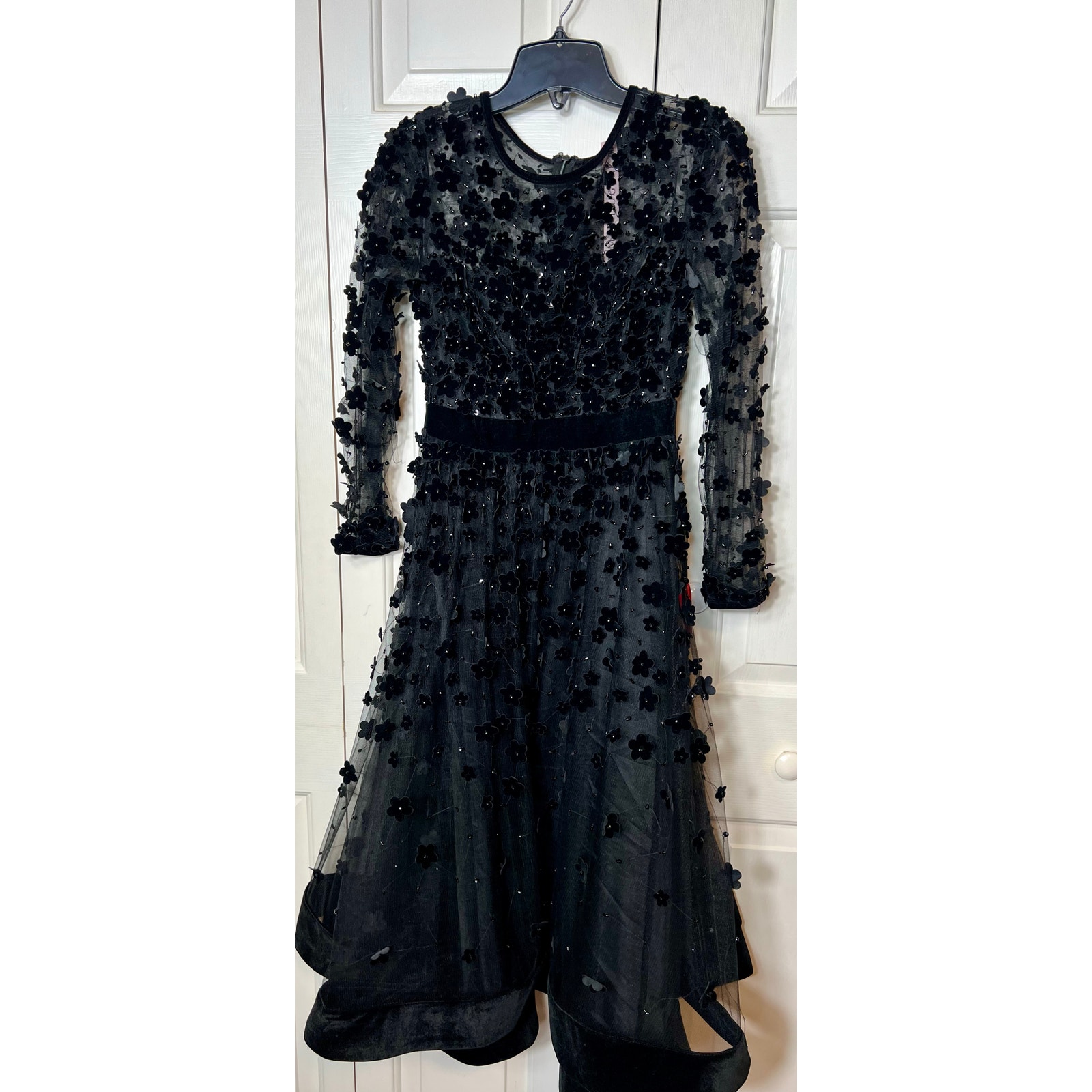 Flaunt your flair for originality in this midi dress embellished with bead-centered velvet flowers and featuring a flared mesh skirt weighted by a velvet hem.