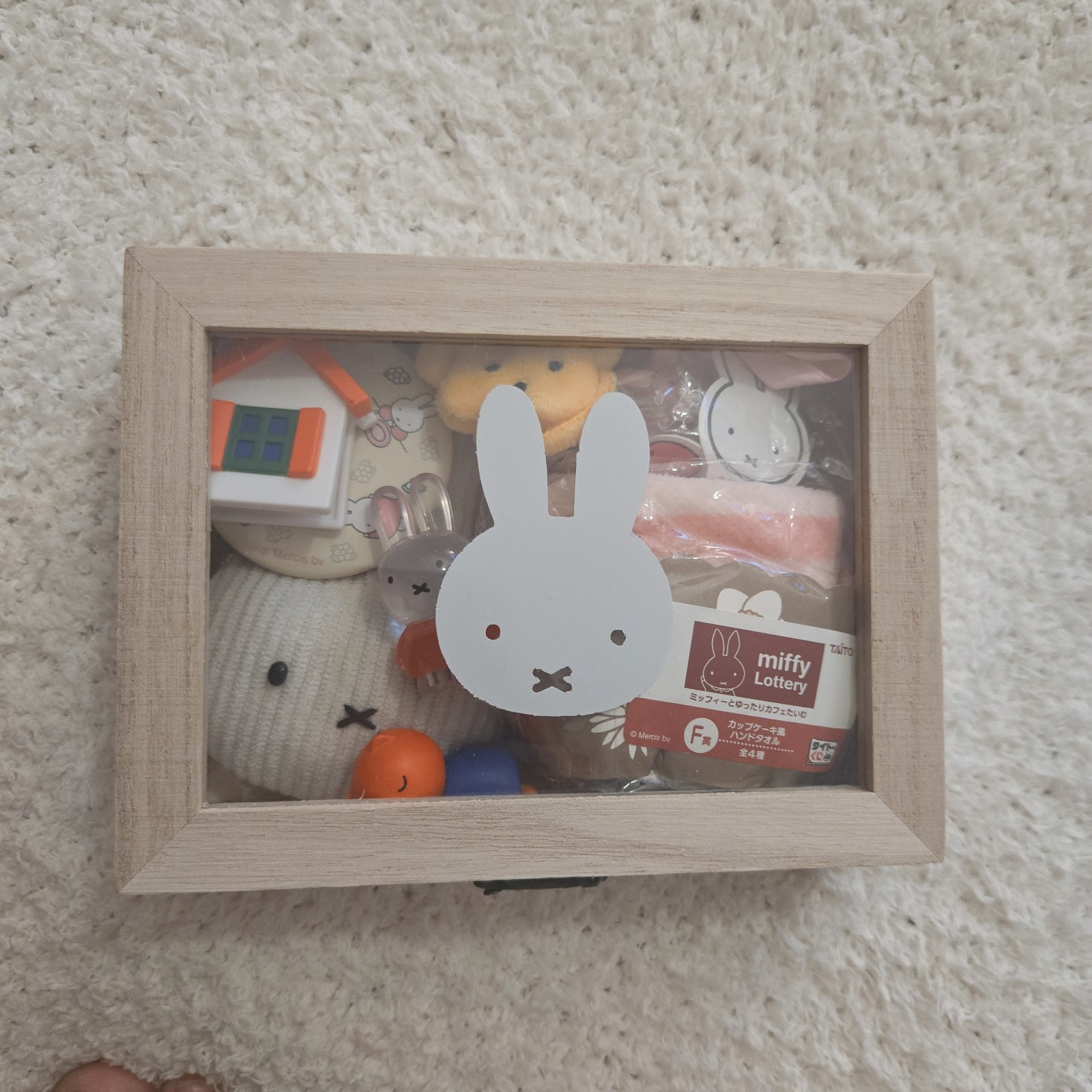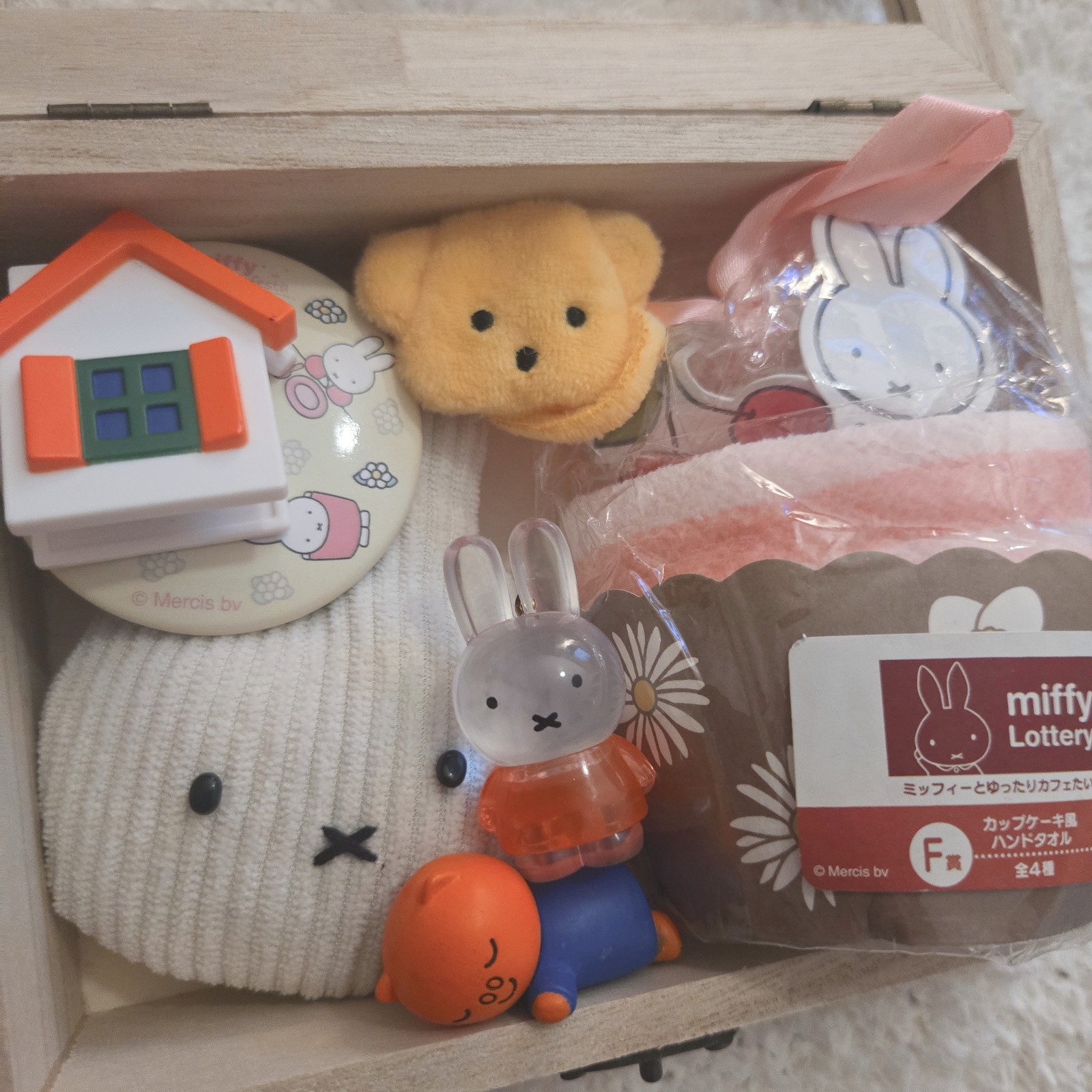 I put Miffy stickers and put Glanty (Miffy's friend) figure, Miffy house clip, miffy figure, sleeping granty figure, badge towel, and handmade mascots and bear mini bag(you can put your plush toy) inside.