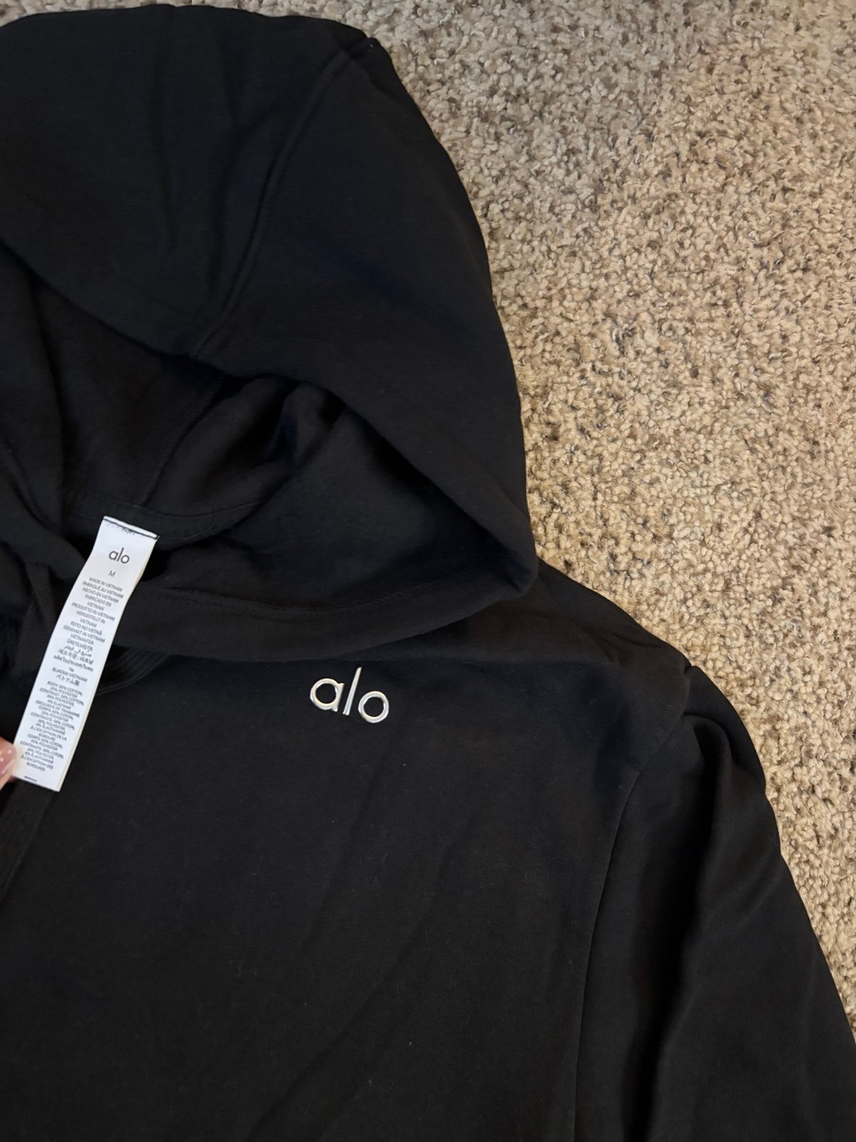 Alo Yoga Accolade Hoodie in classic black, size Medium. A relaxed-fit pullover featuring a kangaroo pocket, drawstring hood with metal logo tips, and embroidered Alo logo at the chest.